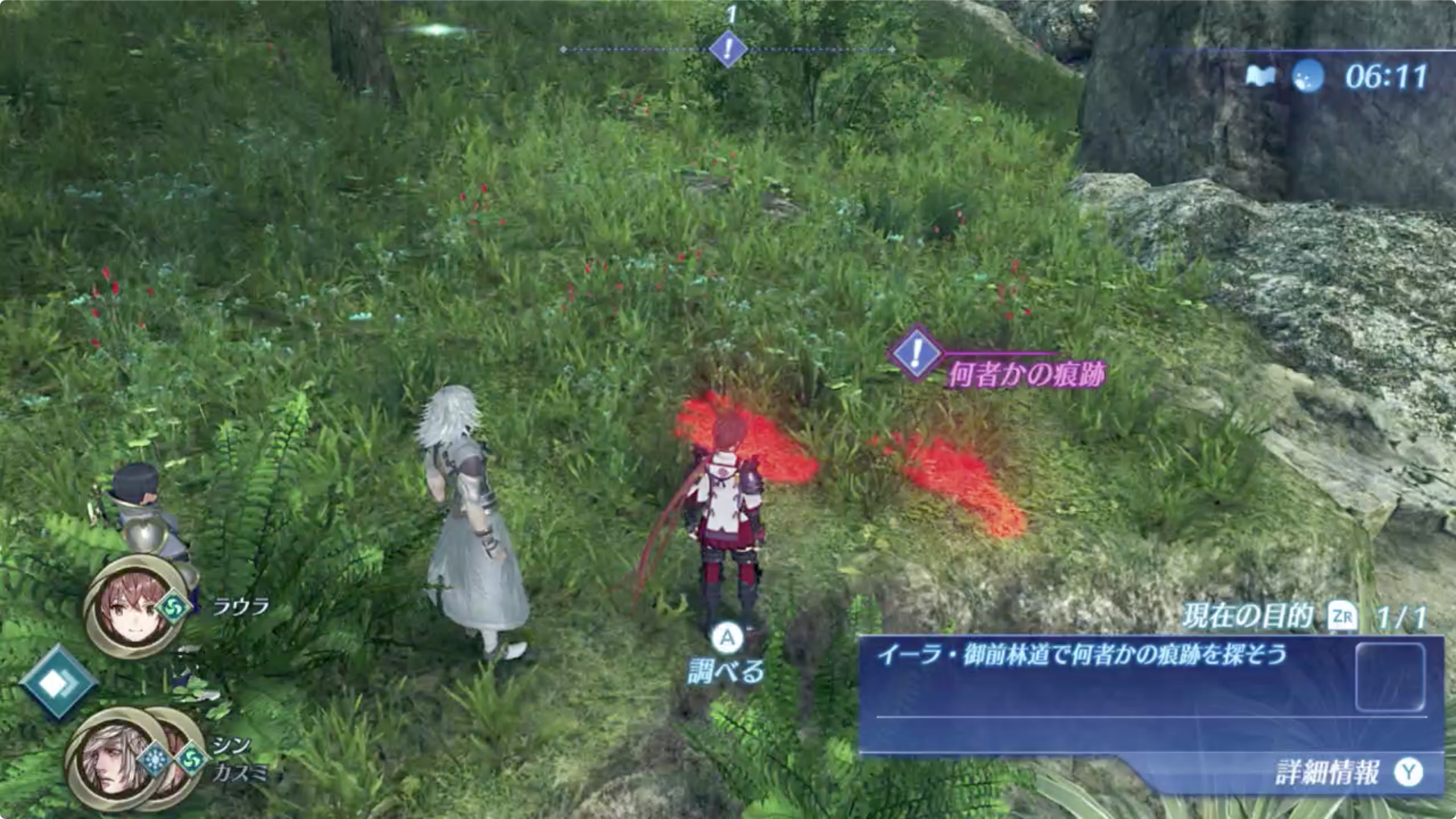1. 왕도 앞 숲길에서 무언가의 흔적을 찾아 조사한다.