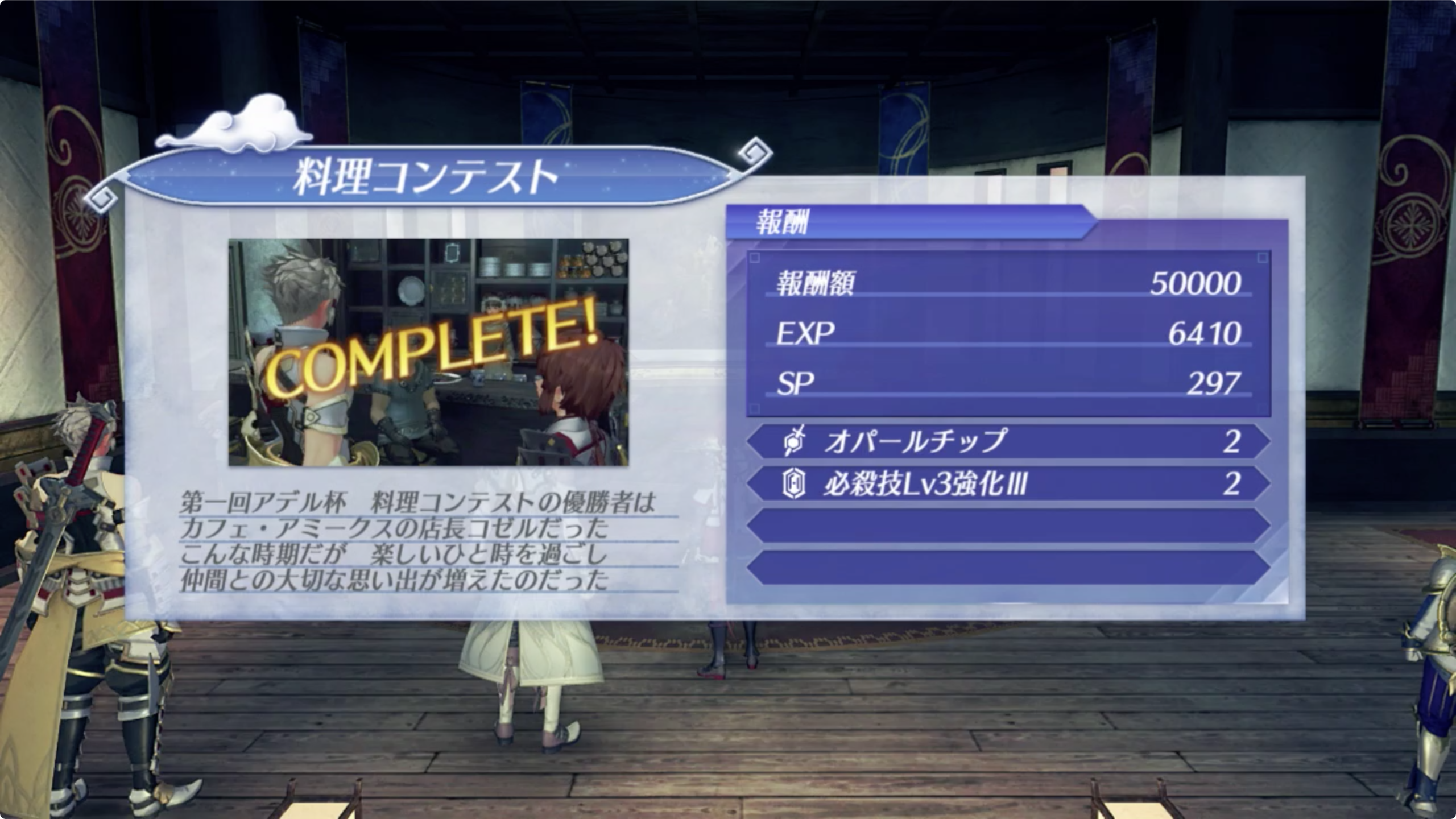 | 선택에 따라 보수액 / EXP / SP의 보상이 변화. 신 특제 타르타리 구이 (シン特製タルタリ焼き) : 50,000G / EXP 6,410 / SP 297 윙 베리 케이크 (ウィングベリーケーキ) : 5,000G / EXP 4,270 / SP 198 아래는 공통 보상 오팔 칩 (オパールチップ) ×2 필살기 LV3 강화 III (必殺技Lv3強化III) ×2 |