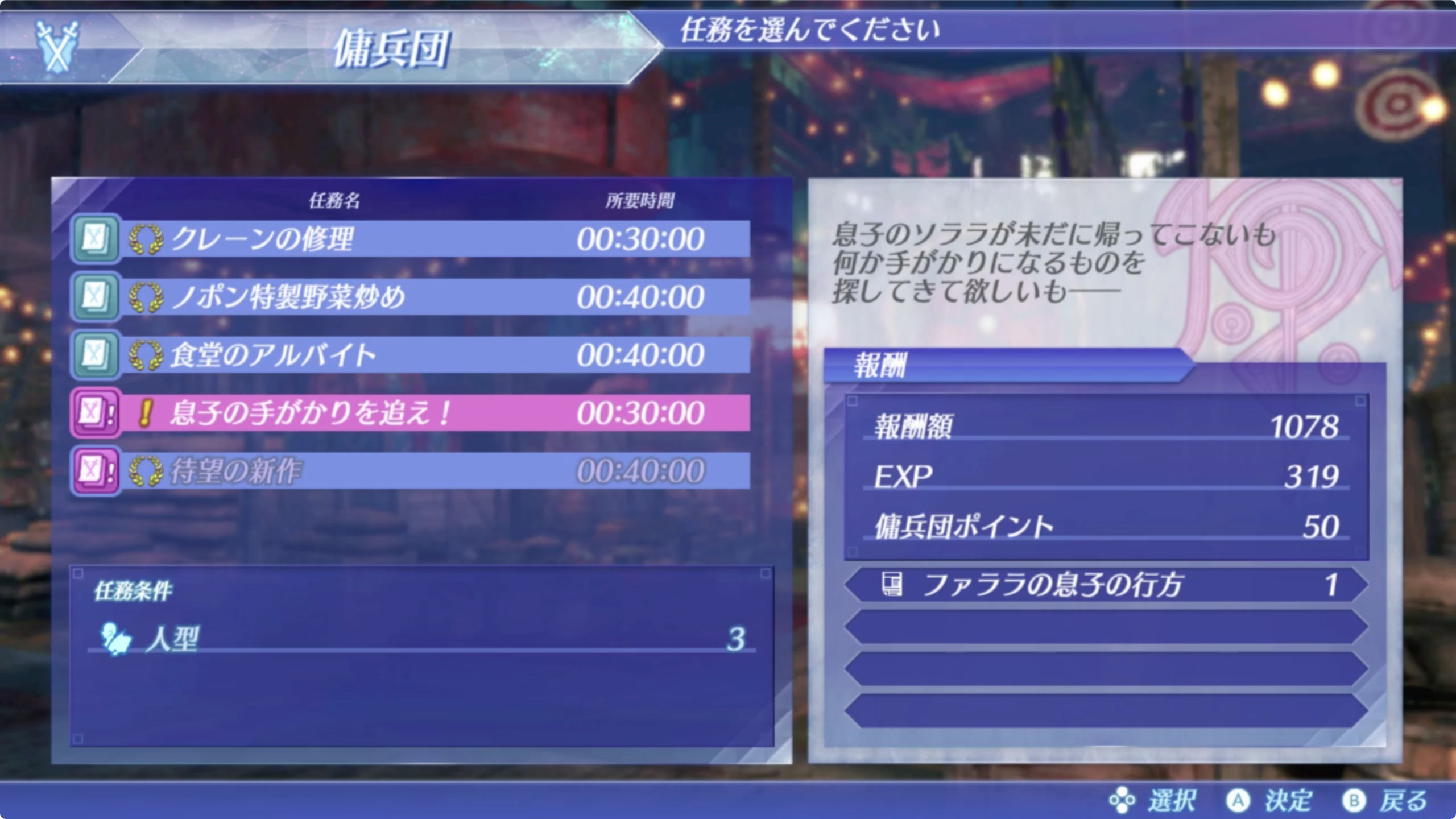 9. 용병단 임무 '아들의 단서를 쫓아라!(息子の手がかりを追え!)'가 발생한다.