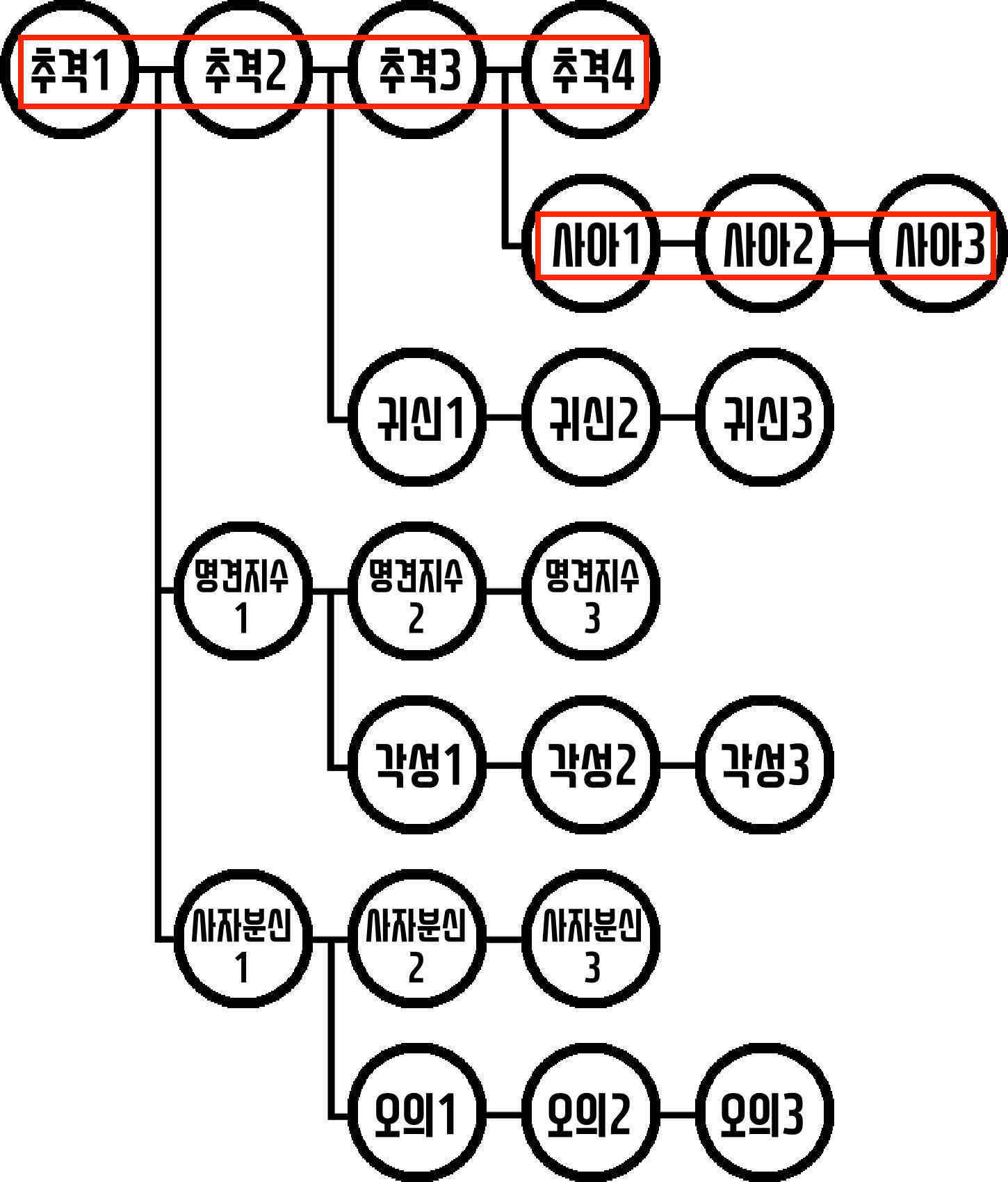 1. 스킬트리처럼 되어있지만 결국 각 행 (가로)가 모두 같은 능력이며 오른쪽으로 갈 수록 효과가 강화됩니다.