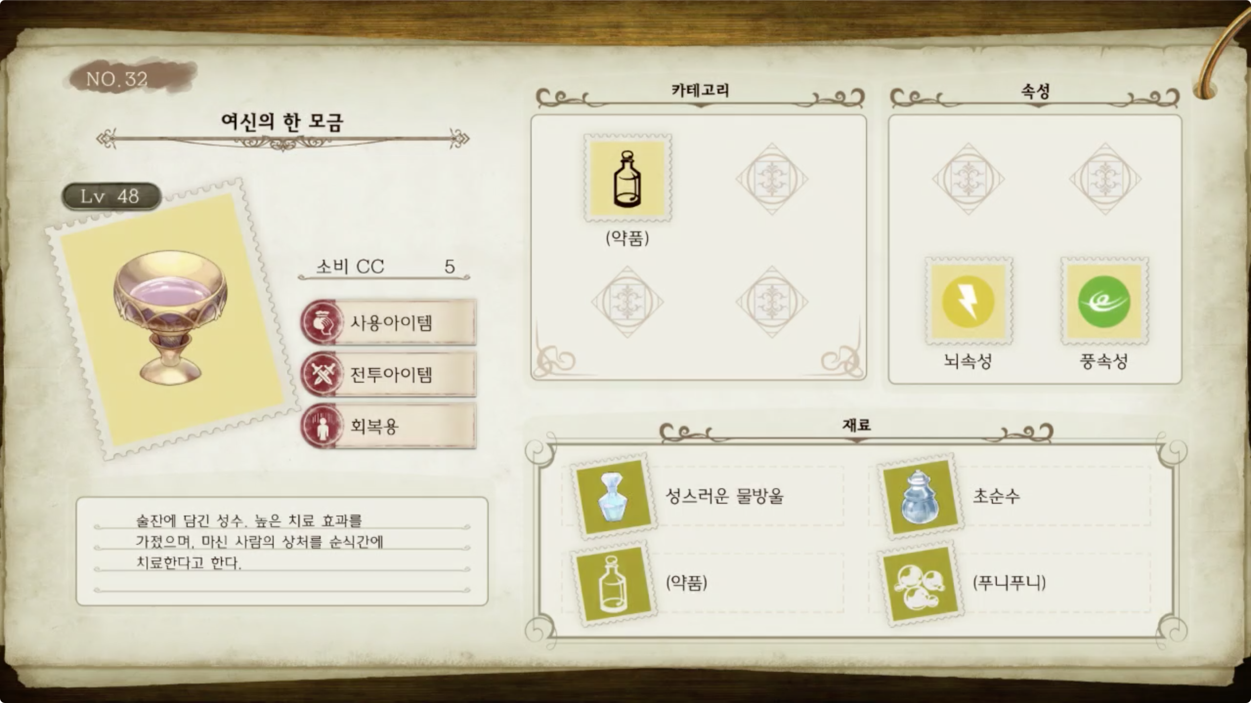 라이자의 아틀리에 - 아이템 도감 NO.032 여신의 한 모금