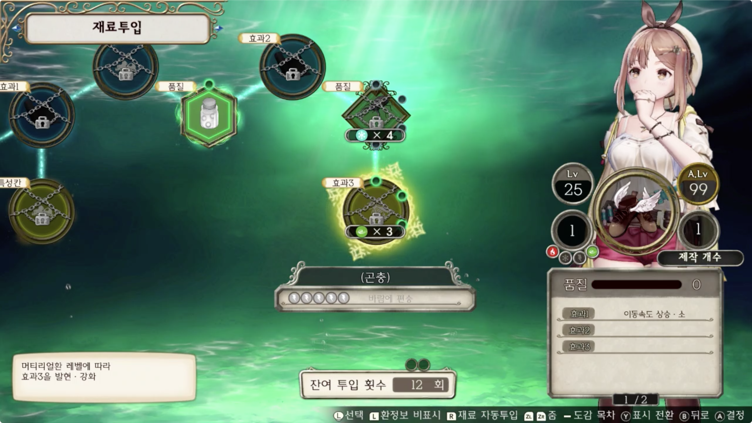제작하기 위해 재료 투입을 할 때 오른쪽 라인의 효과 2 [경쾌하게 뛰기] , 효과 3 [바람에 편승] 을 반드시 활성화 시키도록 하자