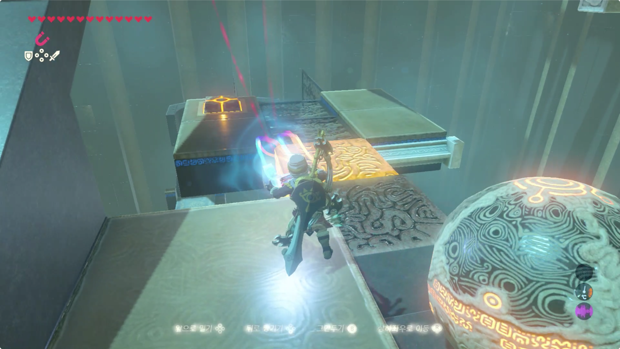 스위치를 밟아서 구슬을 이동시키고. 타이밍에 맞춰 떨어지지 않게 발판을 고정시켜주자.