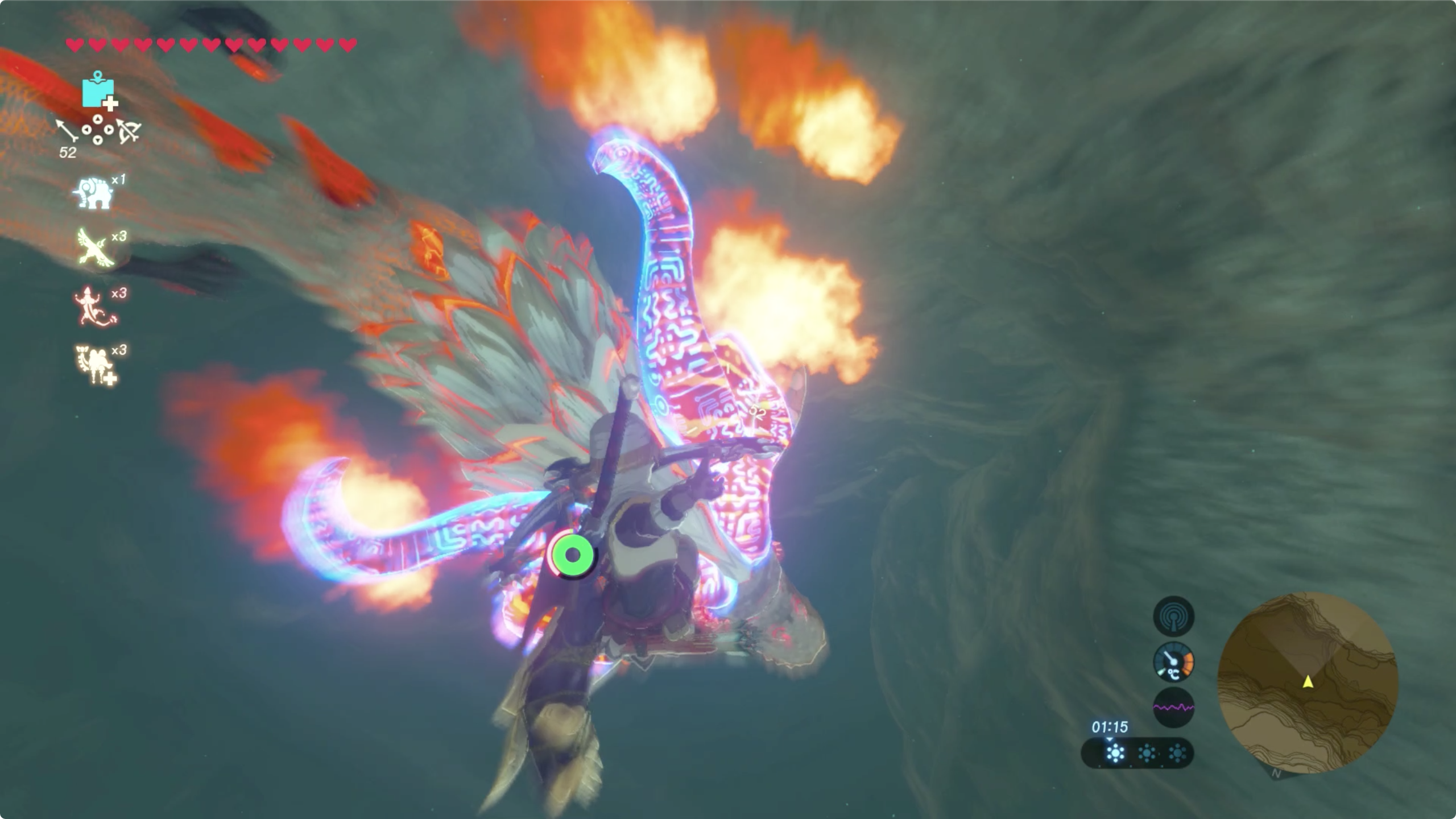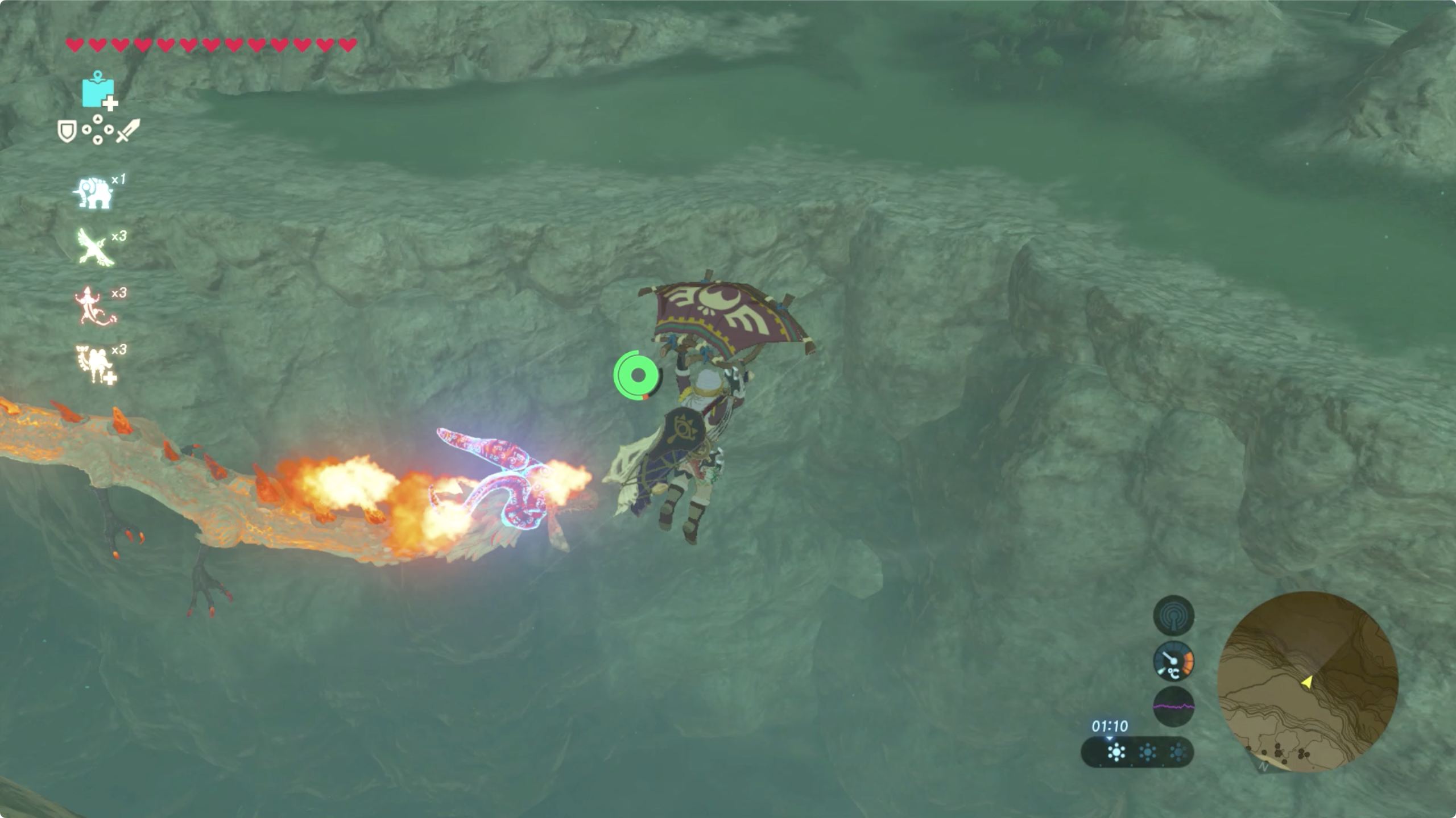 발견하고 지나가는걸 보고 이동하면 늦기 때문에 조금 빠르게 패러세일을 타고 이동해 스크린샷처럼 용의 앞을 향해 이동하면 얼추 용의 뿔 위로 지나갈 수 있습니다.