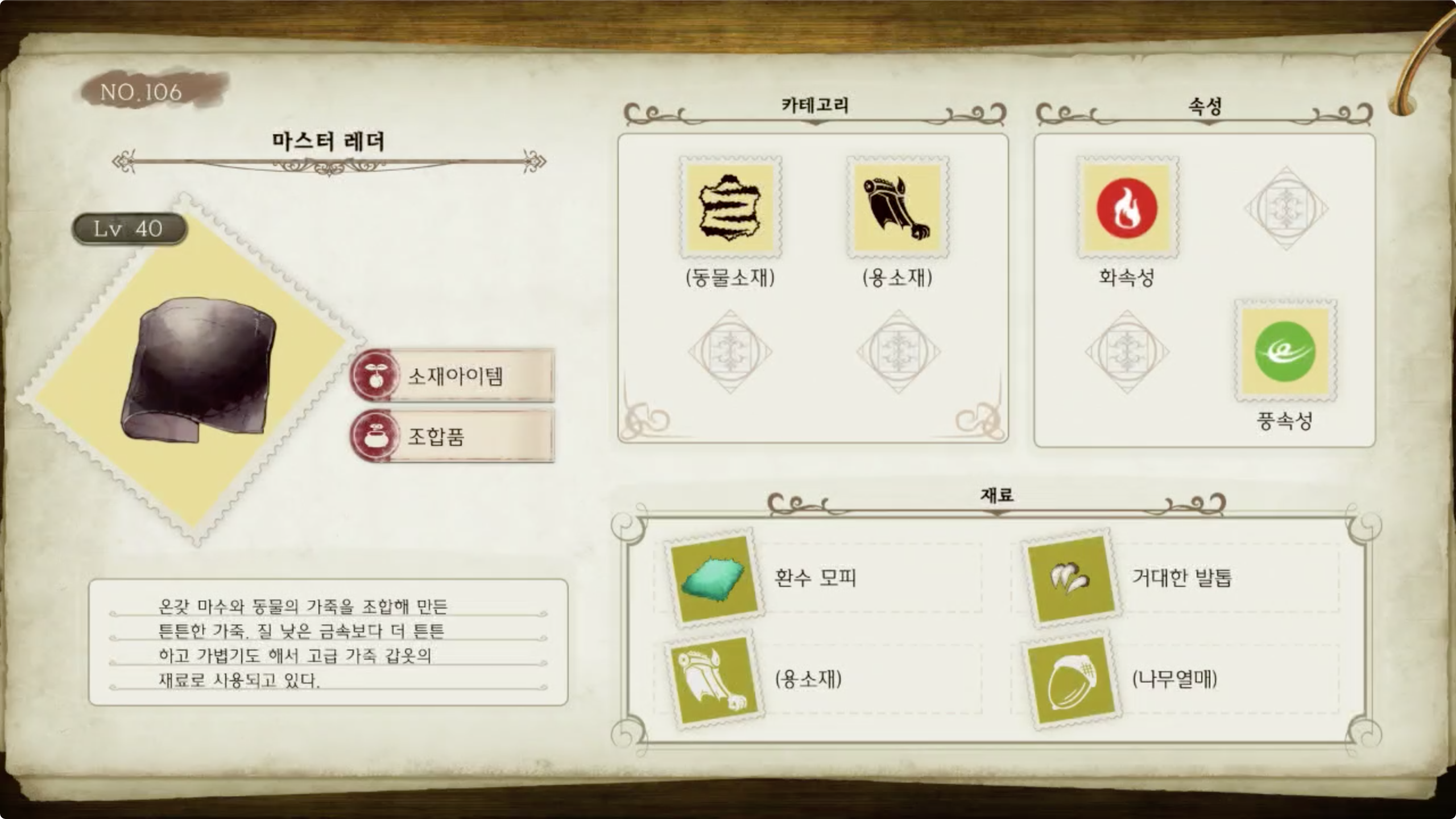 라이자의 아틀리에 - 아이템 도감 NO.106 마스터 레더
