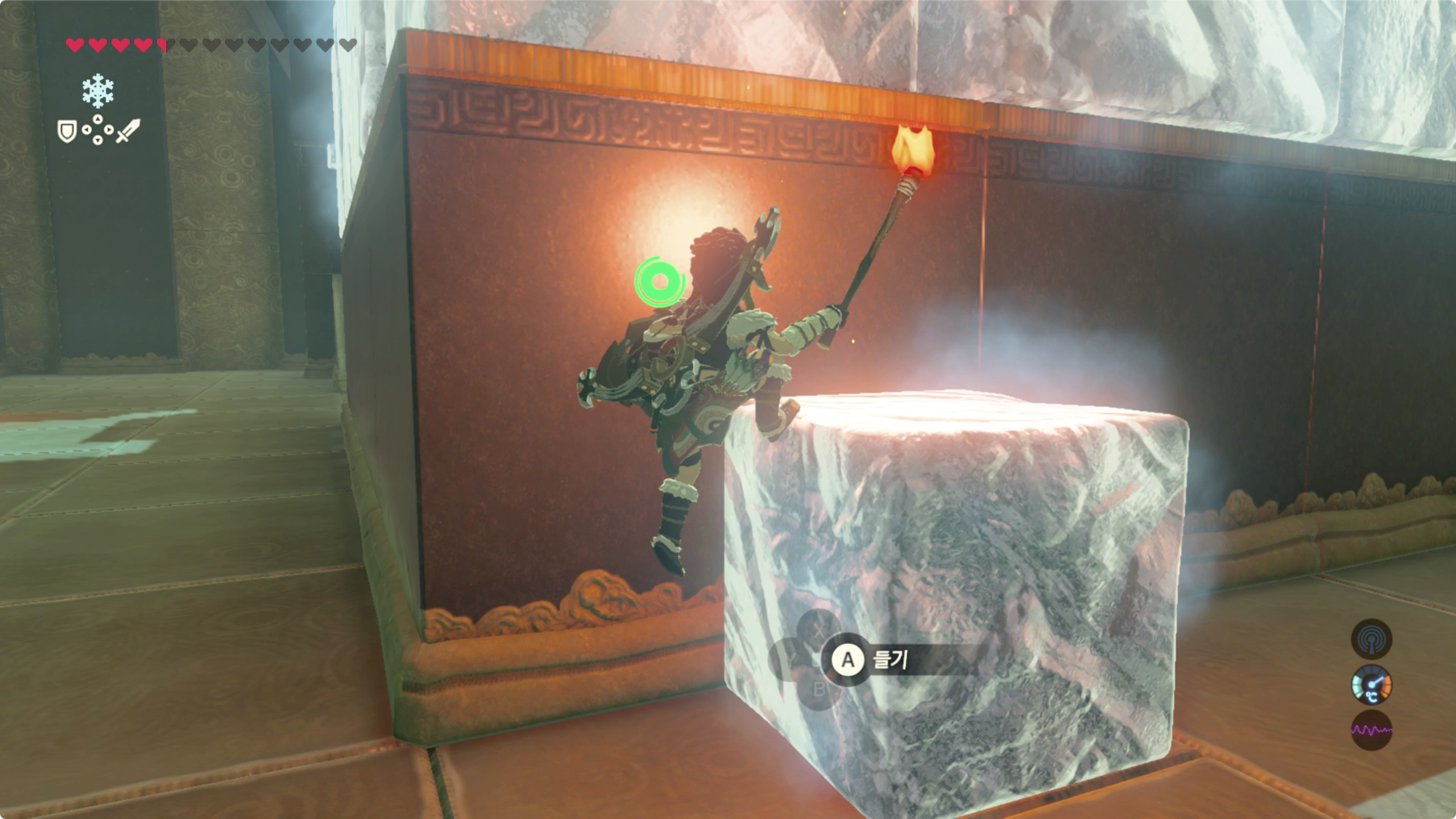 사당에 들어서면 오른쪽에 횃불이 있으니 횃불에 불을 붙여 막고 있는 얼음을 녹이며 길을 만들어 가면 됩니다.