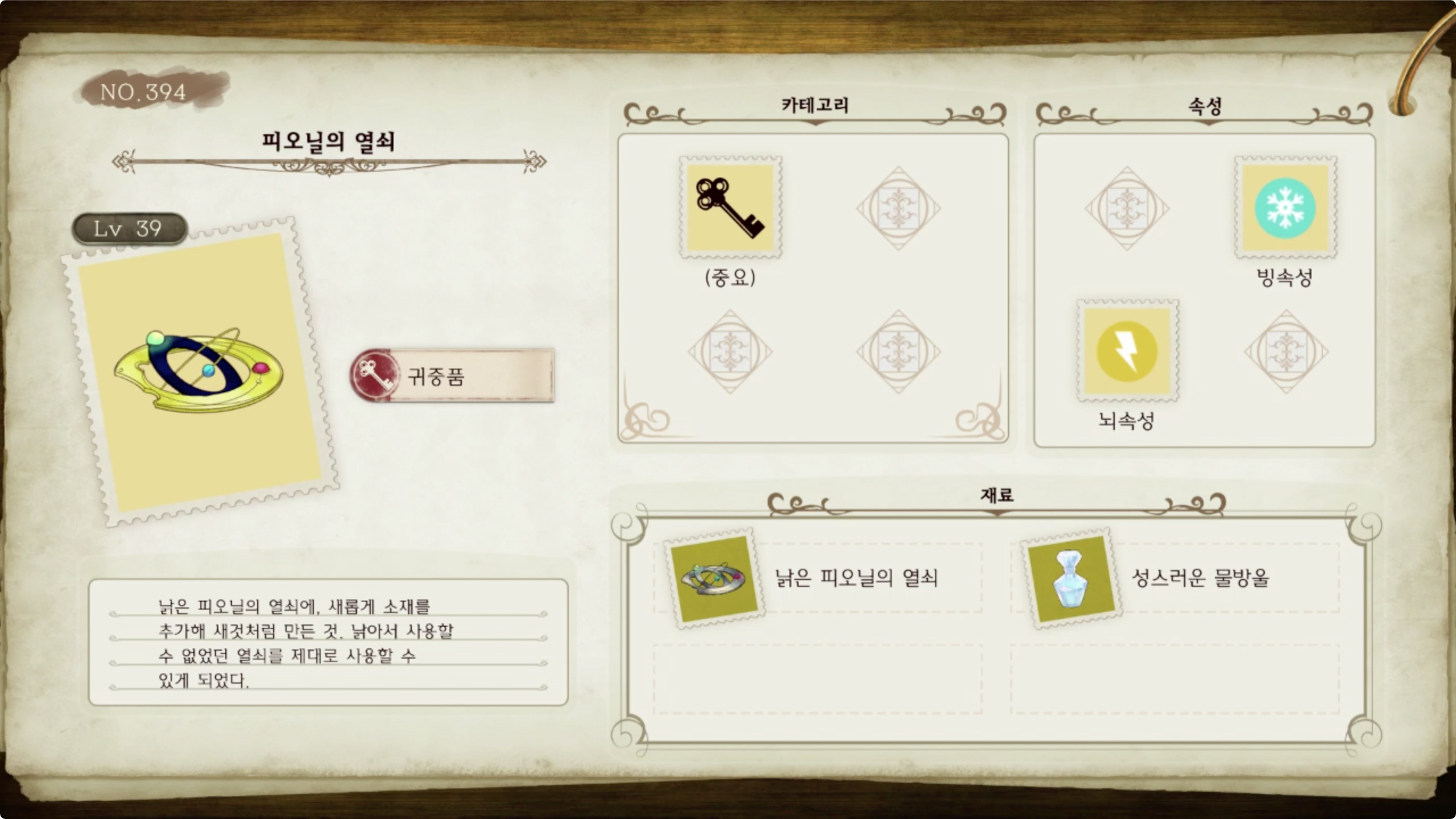 라이자의 아틀리에 - 아이템 도감 NO.394 피오닐의 열쇠