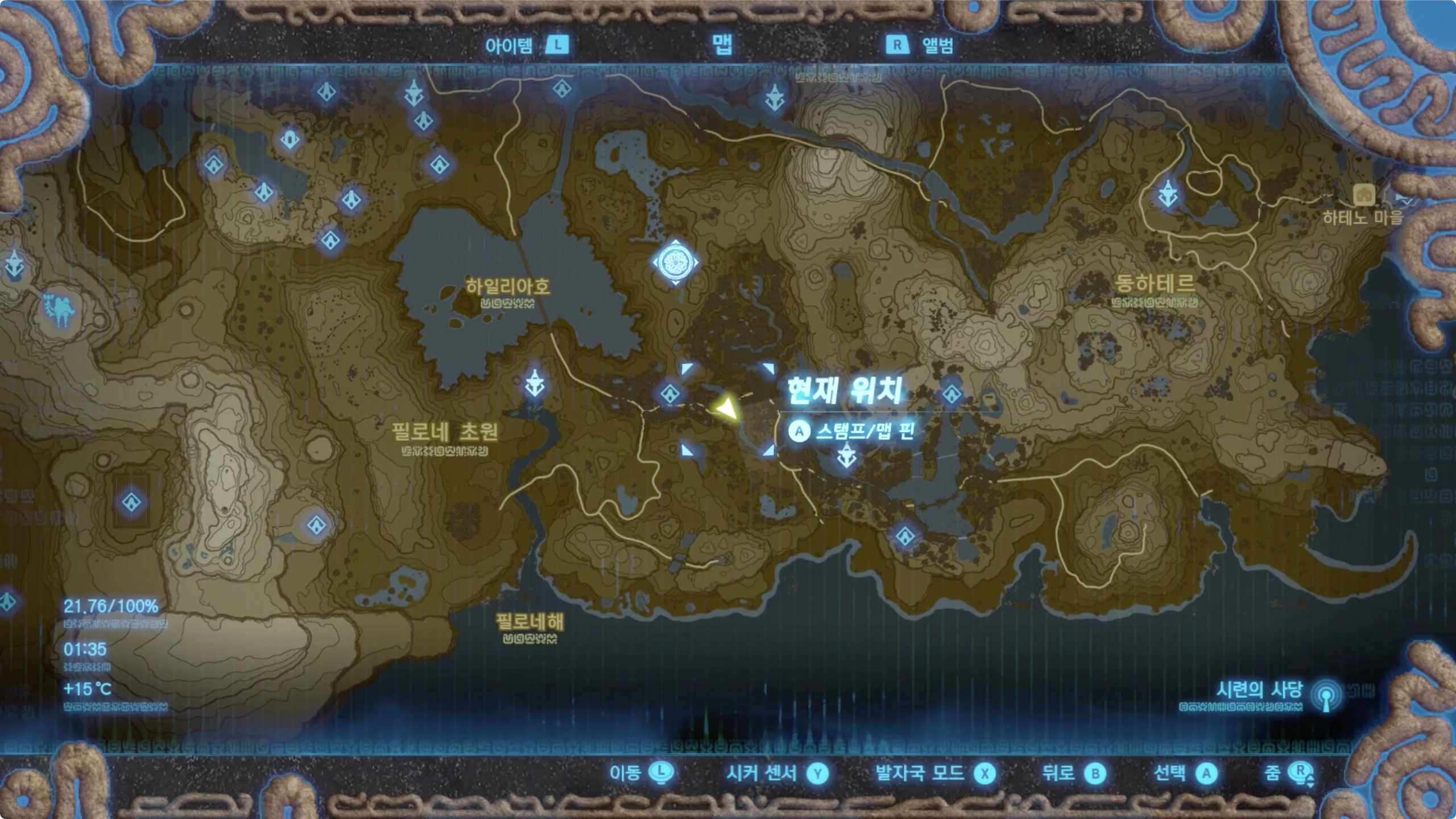지도를 보면 현재 위치에서 북쪽 (약 1시방향)에 이무기의 호수가 보인다. 다음 지도를 참고하여 그곳으로 이동하자.