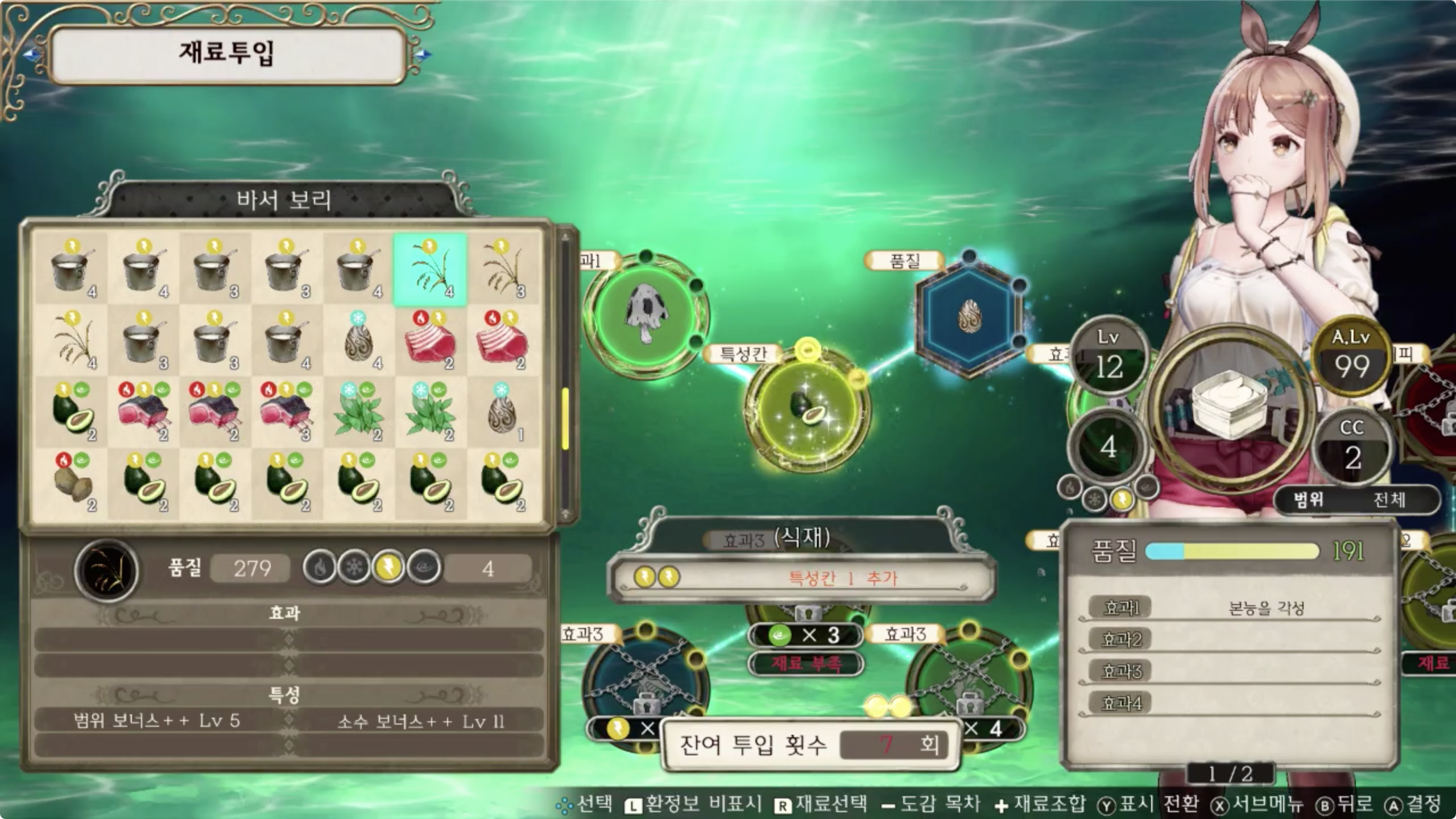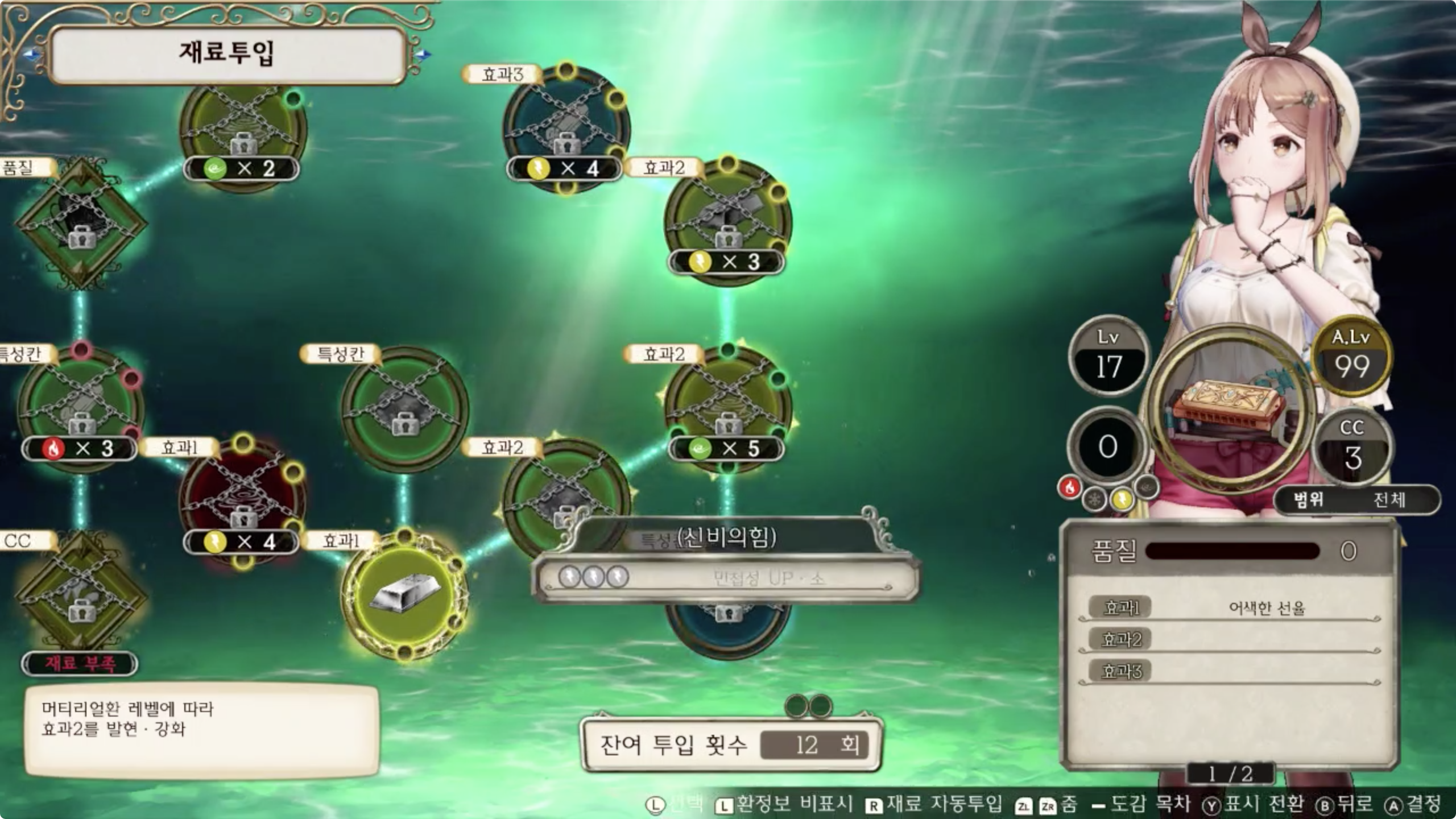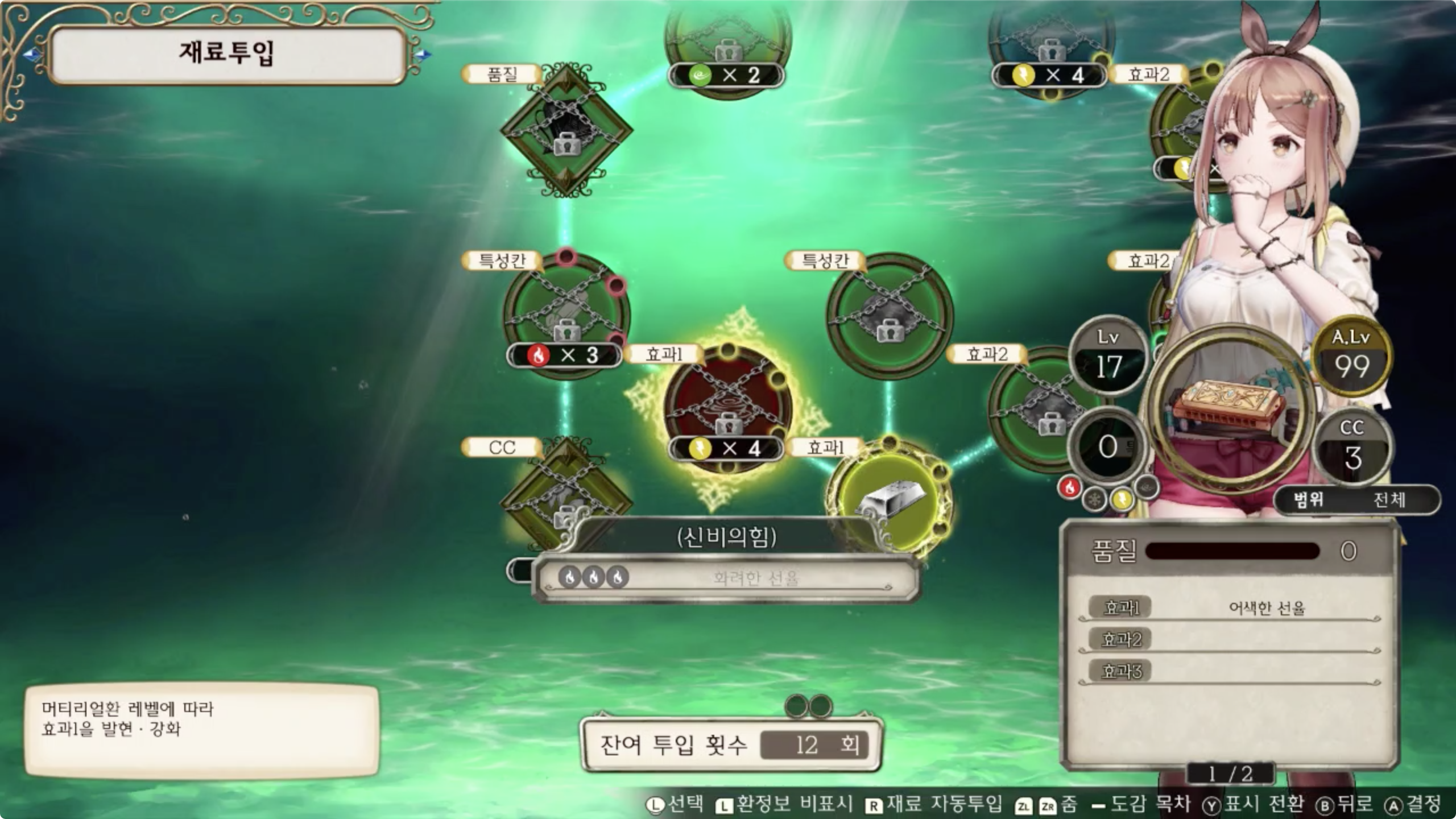 효과의 경우 그 아이템 레시피의 재료투입 화면에서 스틱을 이용해 하나씩 확인해보면 어딘가에 그 효과가 잠겨져 있을겁니다.
