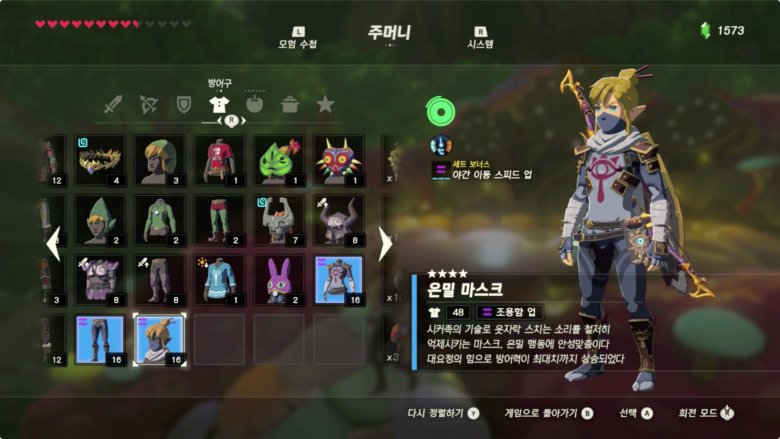 젤다의 전설 : 야생의 숨결의 여러가지 방어구 중에서 개인적으로 가장 좋아하는 세트가 은밀 세트입니다.