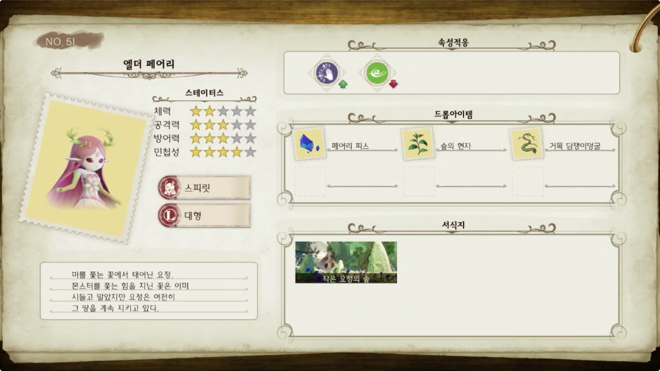 몬스터를 쫓는 힘을 지닌 꽃은 이미 시들고 말았지만 요정은 여전히 그 땅을 계속 지키고 있다.