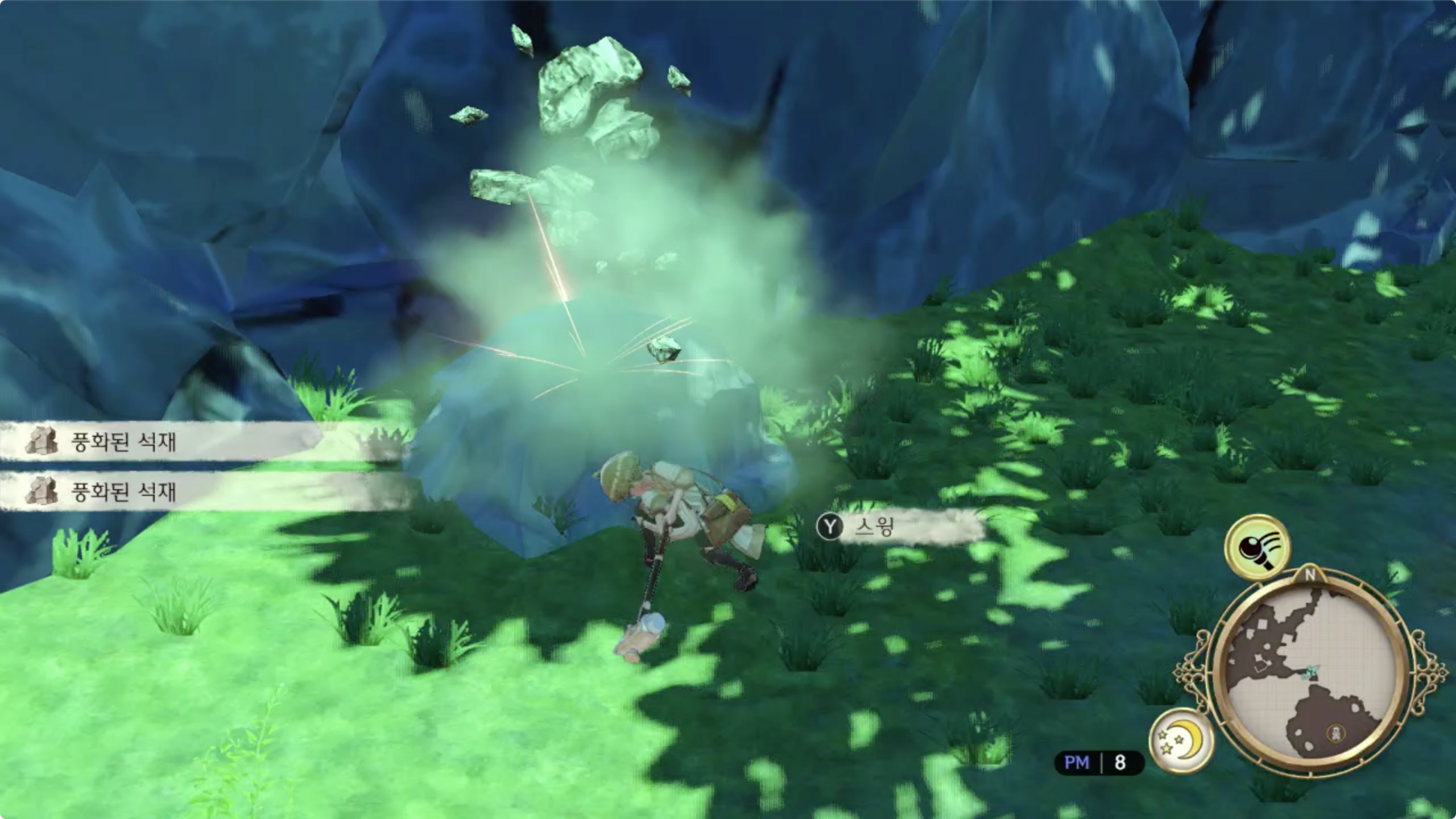 풍화된 석재는 숲속 유적의 동쪽 바위 틈 앞에 있는 바위를 부수면 획득 할 수 있다.