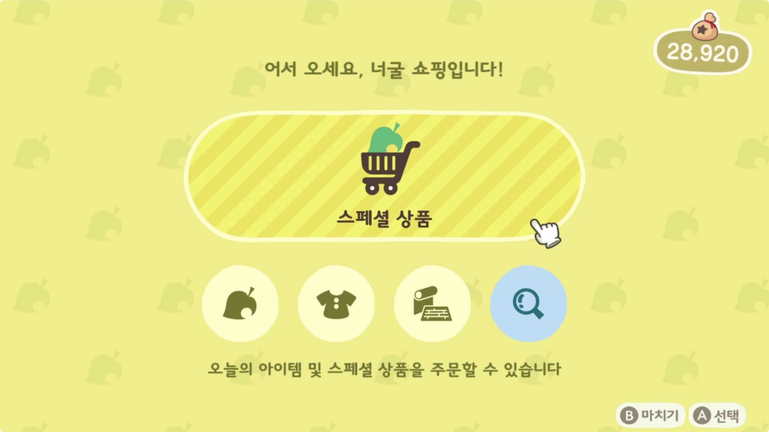 다운이 완료된후, 너굴 쇼핑의 스페셜 상품 중 이벤트 카테고리를 확인하면 포켓 캠프에서 나왔던 아이템들을 구매할 수 있게 됩니다.