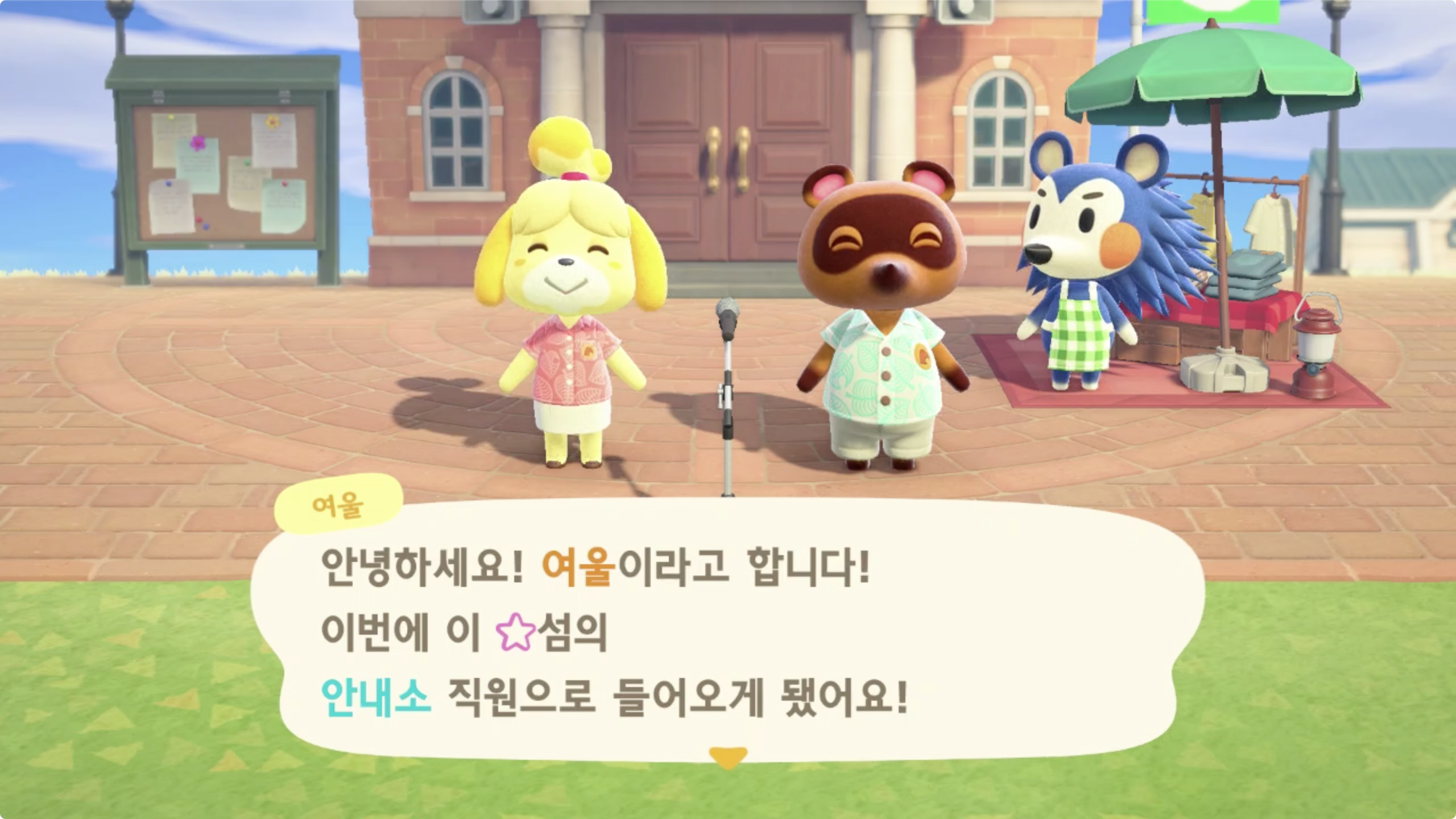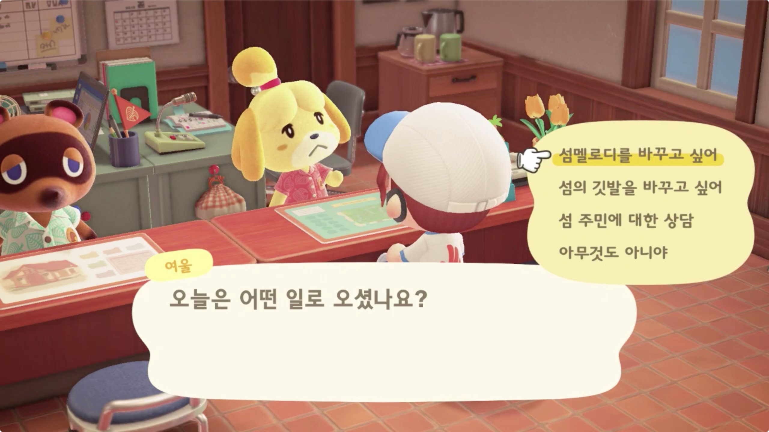 섬의 멜로디 변경(여울이가 마지막에 한번 불러준다. 귀엽다!), 섬의 깃발 변경(마이디자인 이용), 섬 주민에 대한 상담 (주민의 말버릇이나 옷차림 등에 영향을 준다)이 있다.