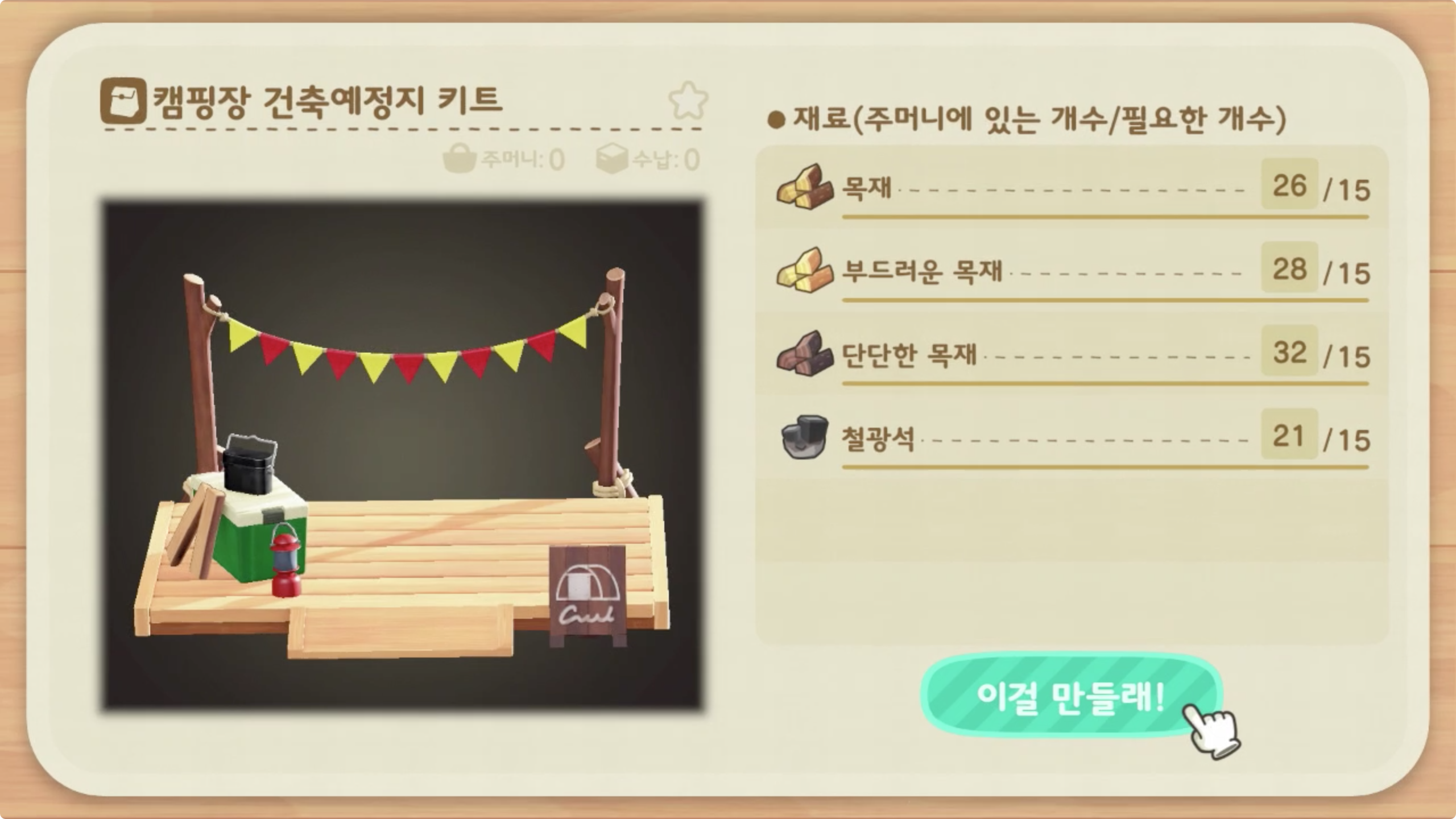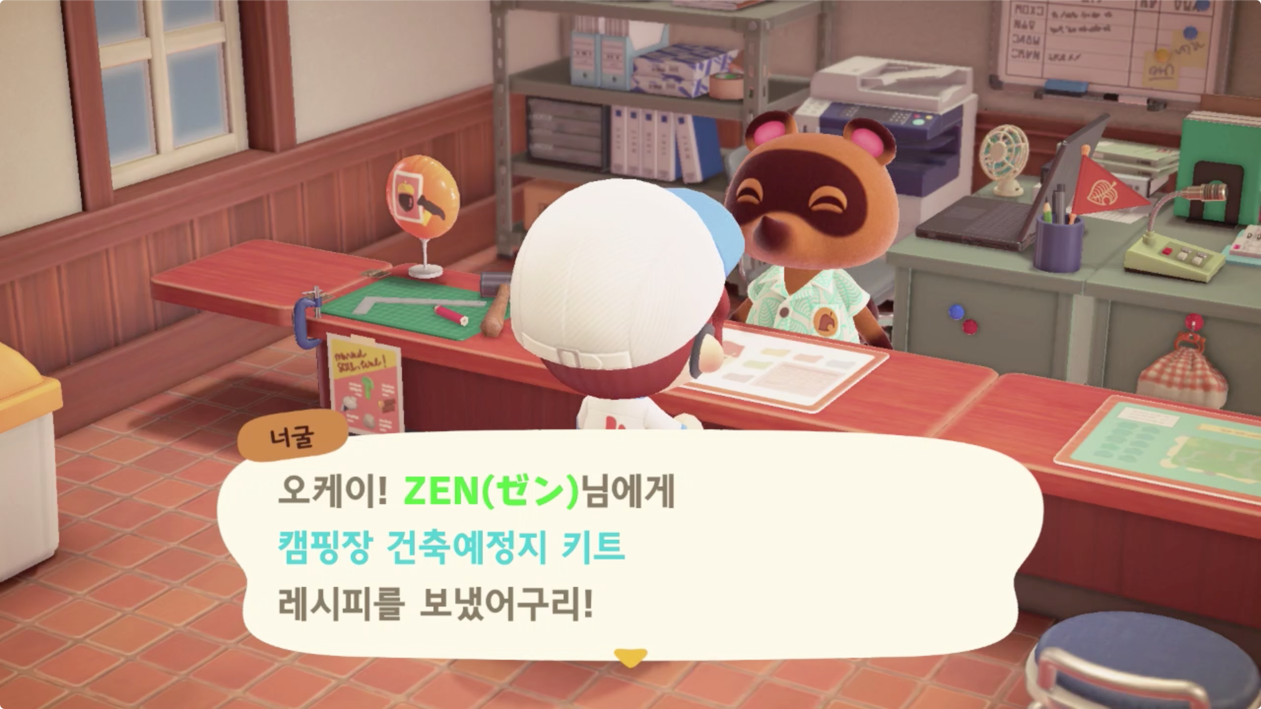 제작한 후 원하는 자리를 설정하고 너굴이에게 다시 보고를 하자.