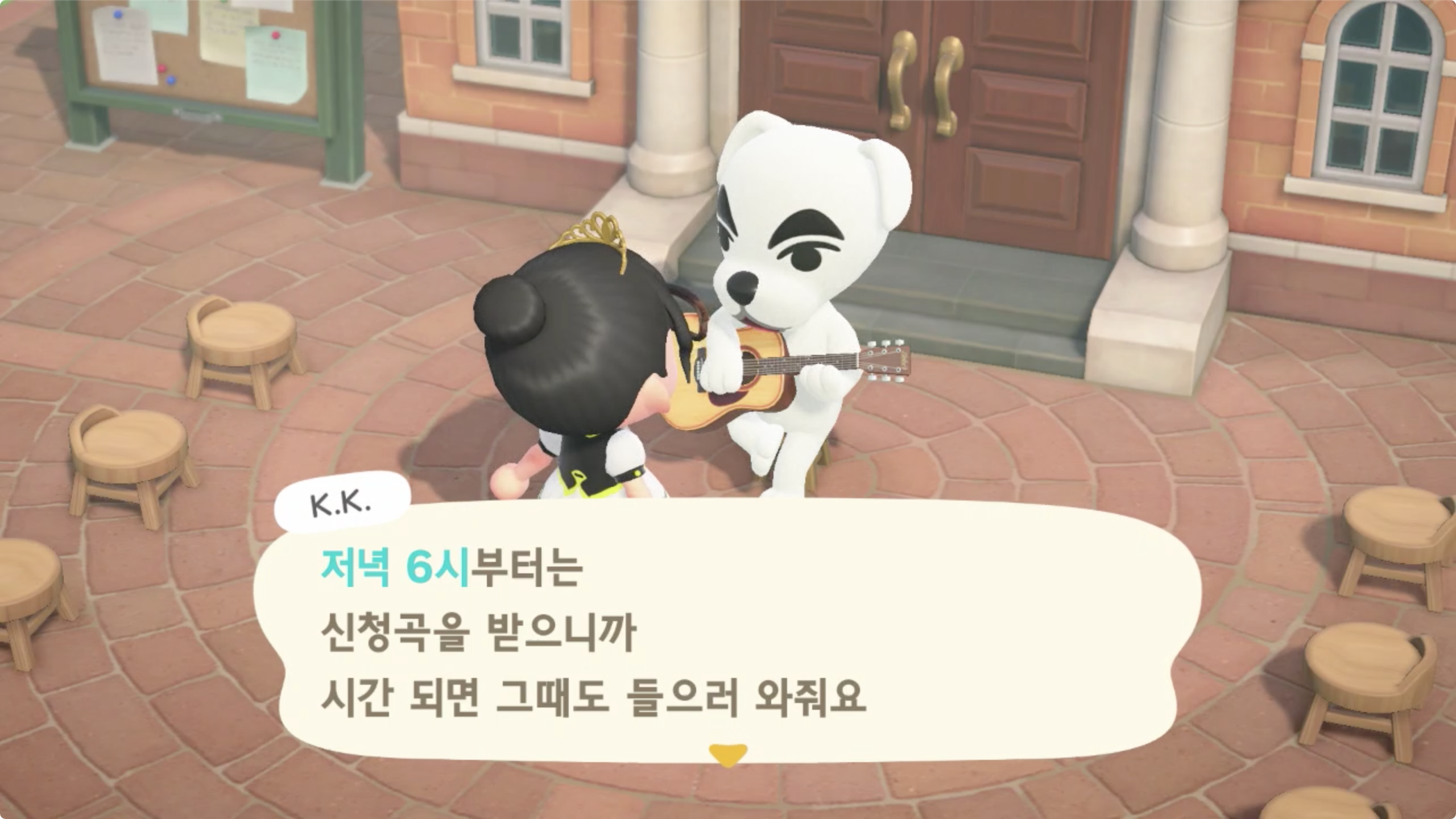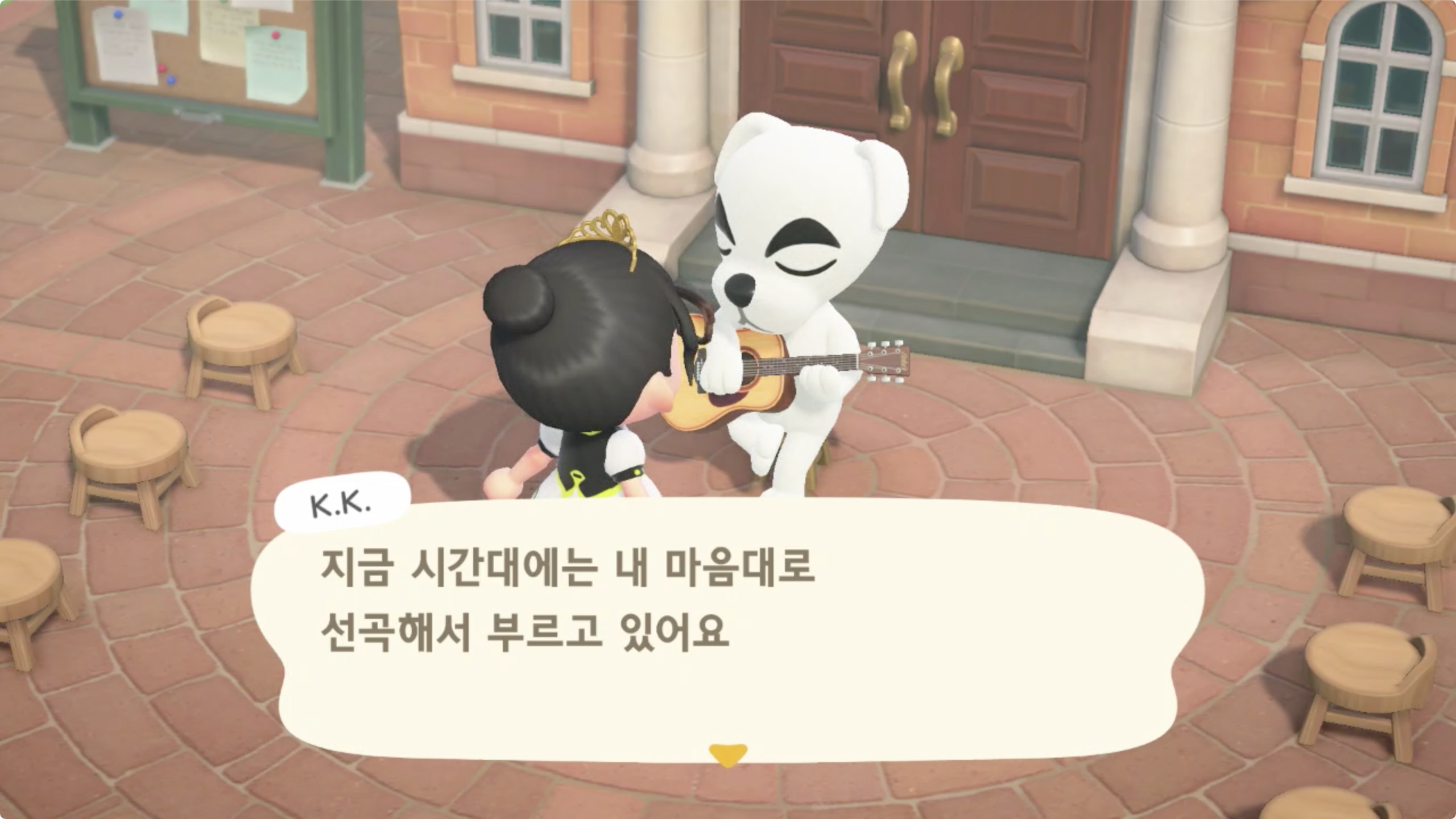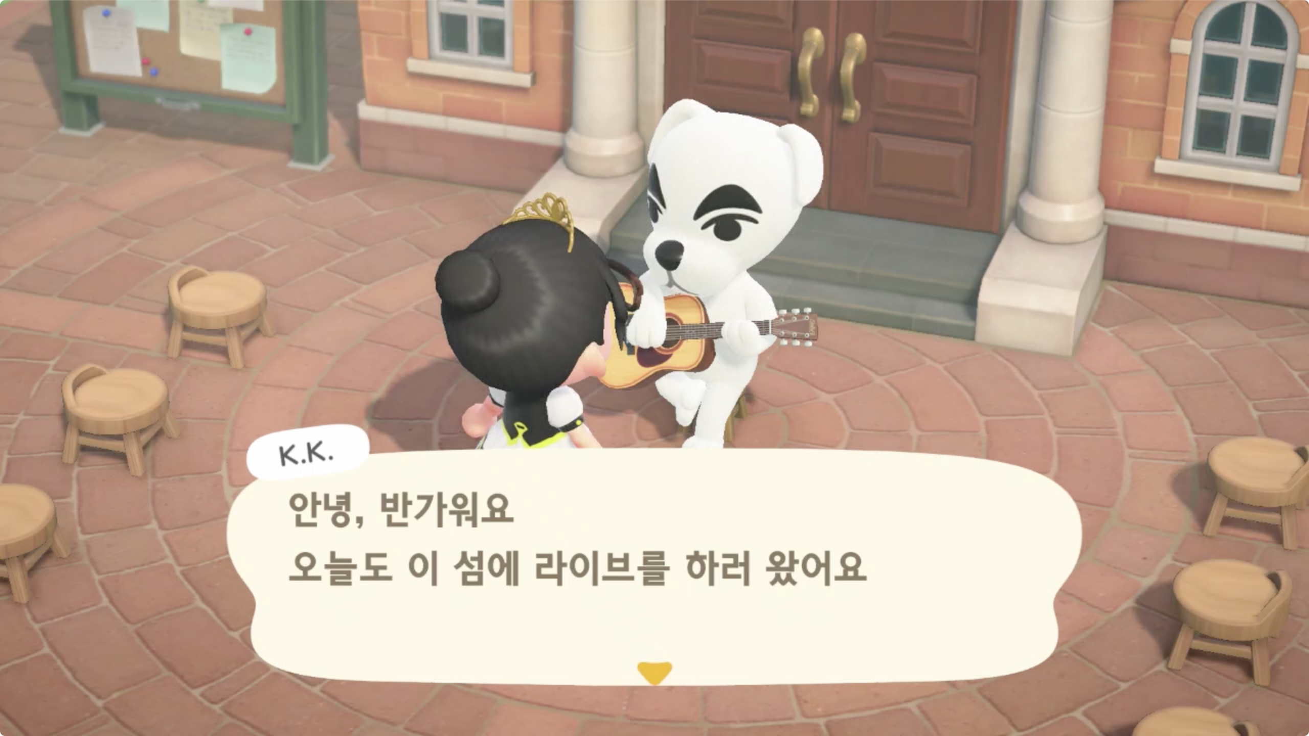 모여봐요 동물의 숲에서는 메인 스토리의 최종 목표 (엔딩?)가 K.K.를 초청해 라이브를 하고자 하는것이며,