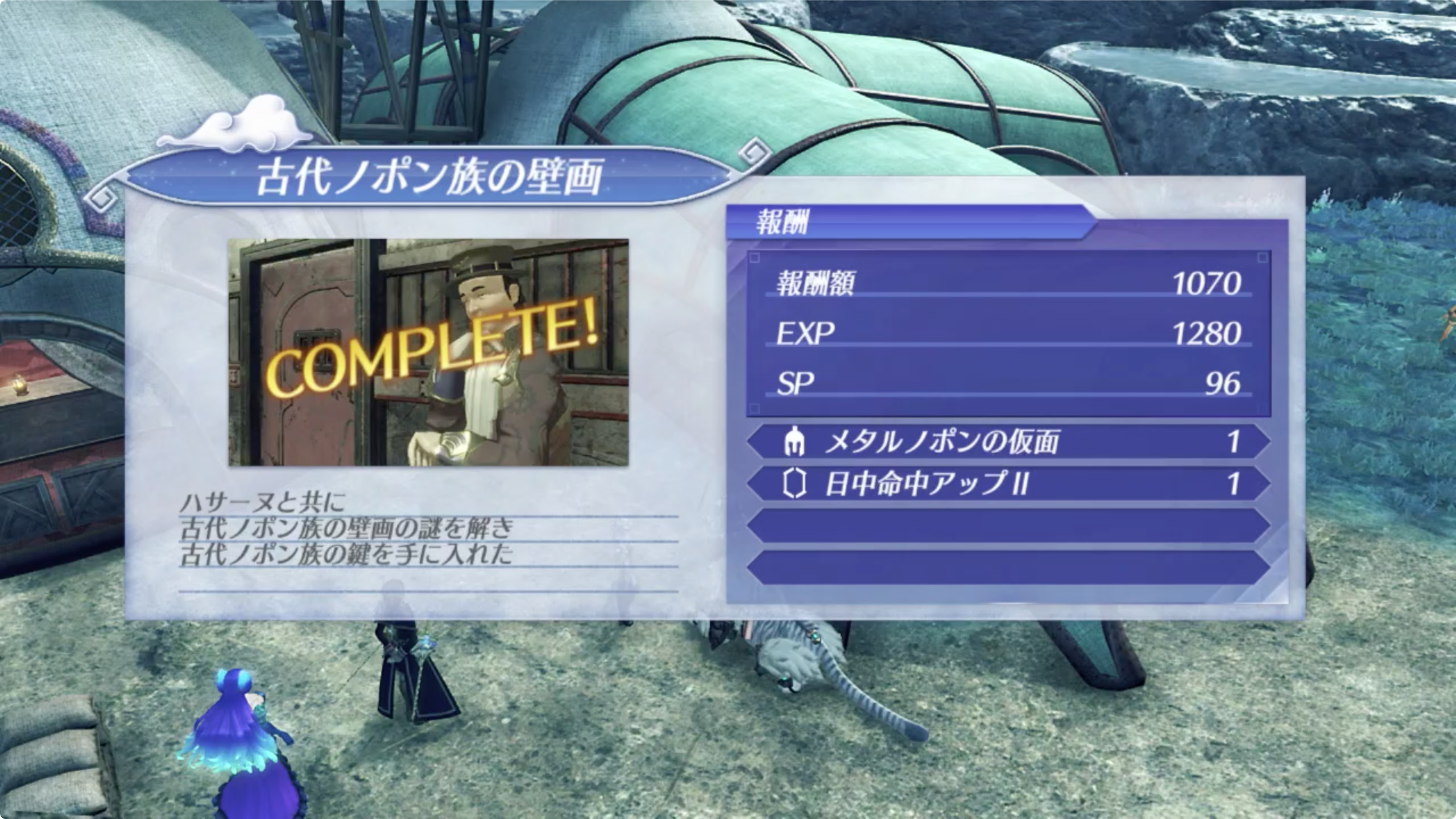 07. 다시 흐레스벨그 마을(フレースヴェルグの村)의 출발의 시장(出発の市場)에 있는 하사누(ハサーヌ)에게 보고를 하면, 고대노폰족의 열쇠(古代ノポン族の鍵)를 입수하며 퀘스트는 완료된다.