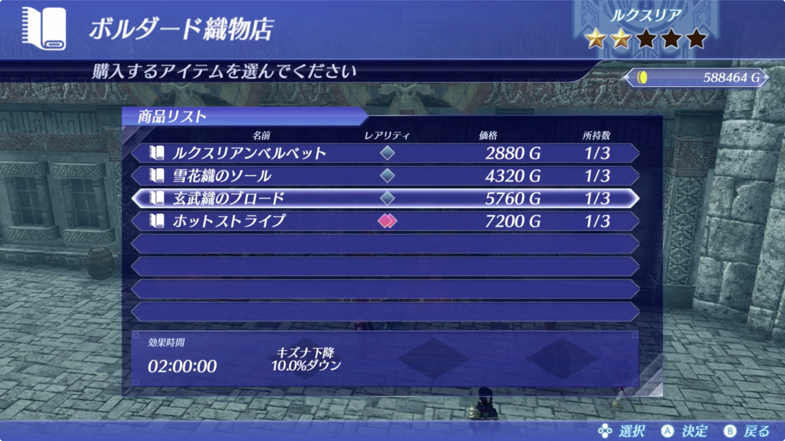 04-3. 룩스리아(ルクスリア)・보르다드 직물가게(ボルダード織物店)에서 현무천의 브로드(玄武織のブロード)를 3개 구입한다.