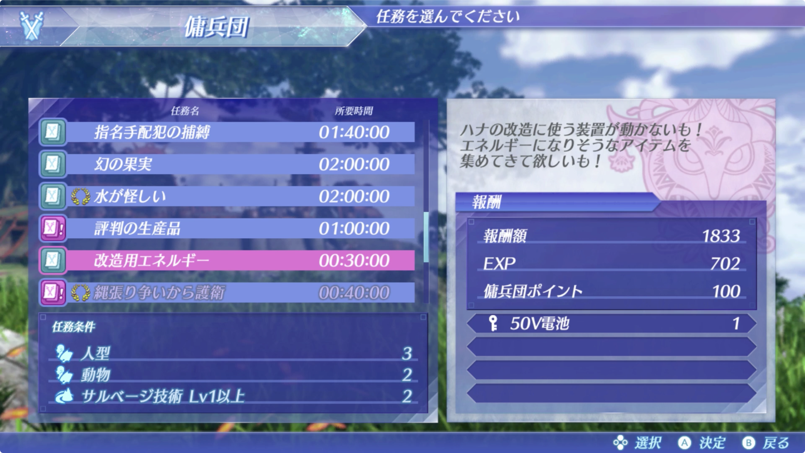 • 50V전지(50V電池) - 달성도 30 : 용병단 임무 '개조용 에너지(改造用エネルギー)'를 통해 입수 가능 - 30분