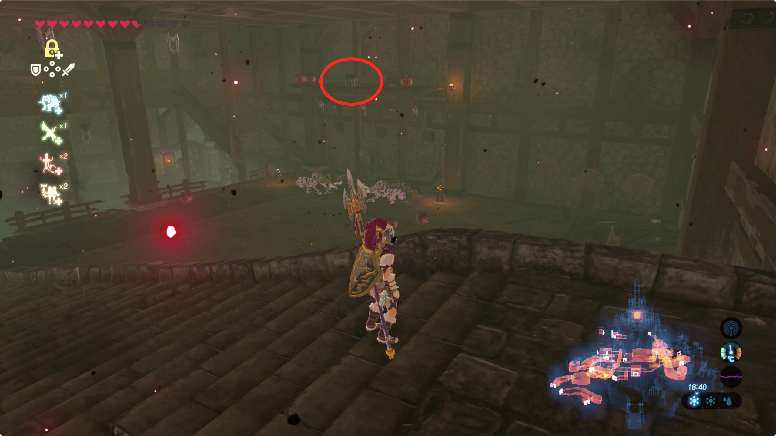 안쪽에 뭔가 벽돌의 모양이 다른게 있는데 이곳을 파괴해주면 방이 나타나며 보물상자를 발견할 수 있다.