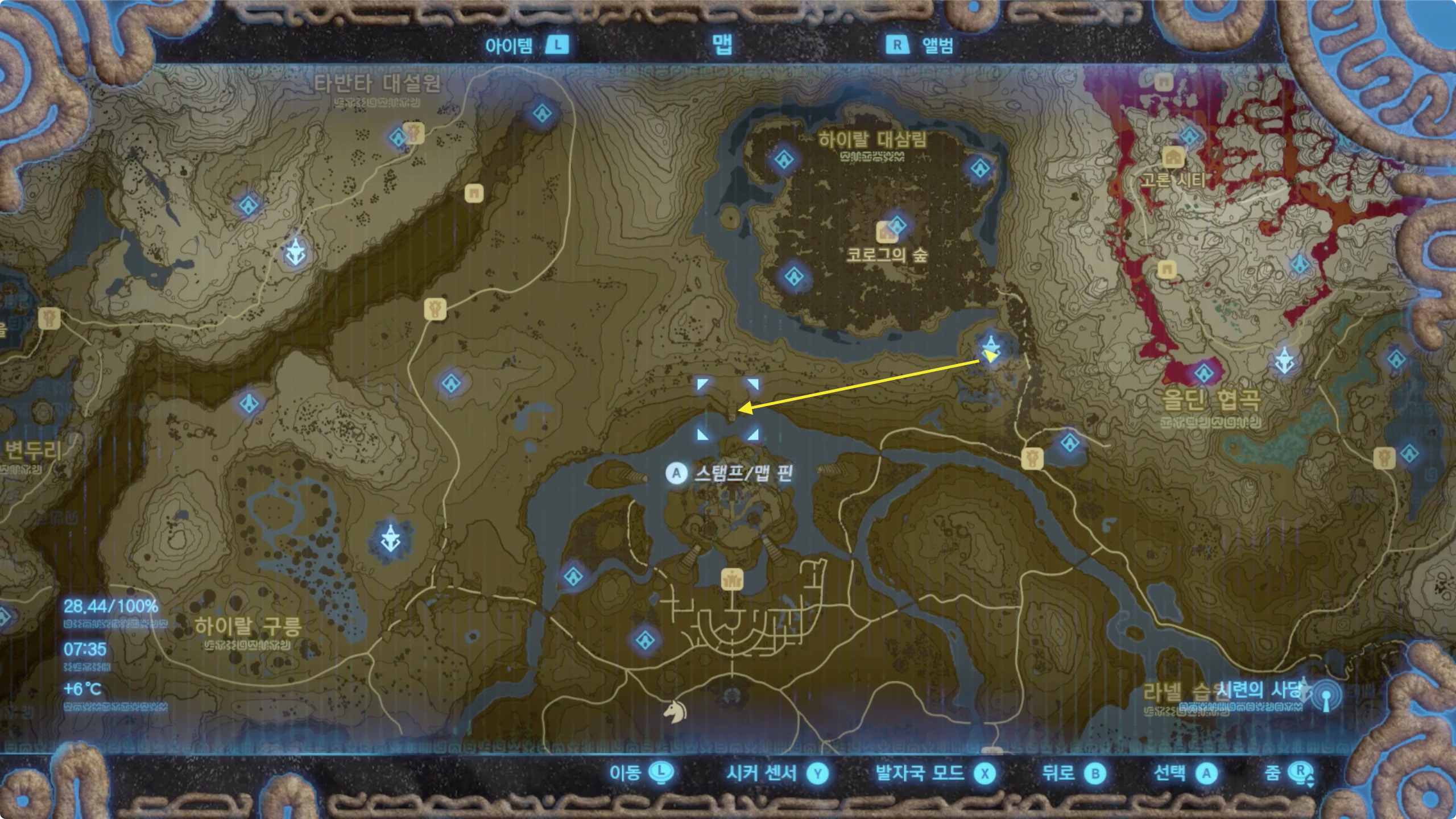 우선 코르그의 숲에 가장 가까운 탑으로 이동하여 하이랄 성의 뒤쪽언덕에 마커를 찍은 후 그곳으로 이동하자.