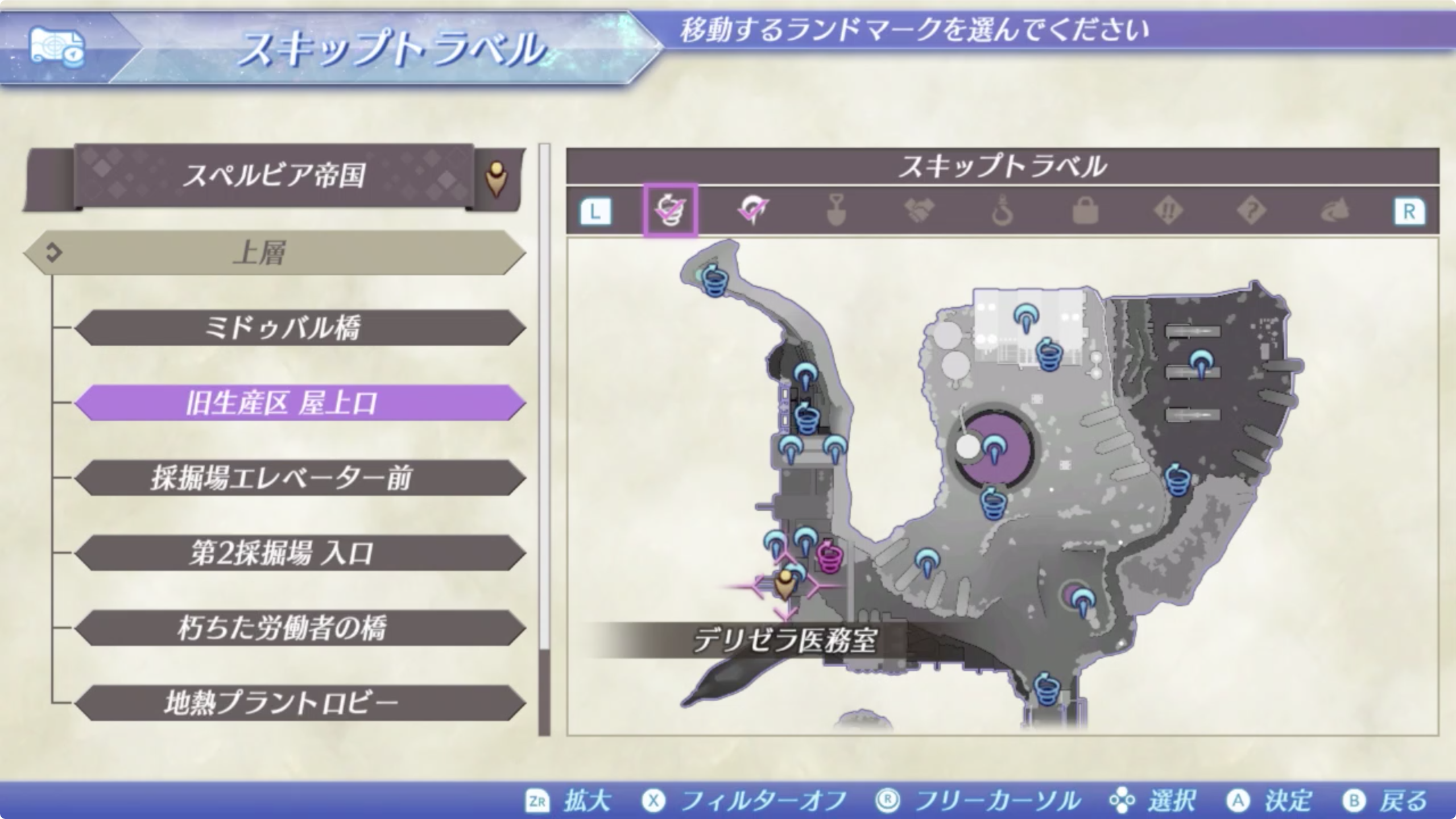 가까운 스킵 트래블 포인트는 스펠비아 제국 (スペルビア帝国) > 상층(上層) > 구 생산구역 옥상 입구(旧生産区 屋上口)