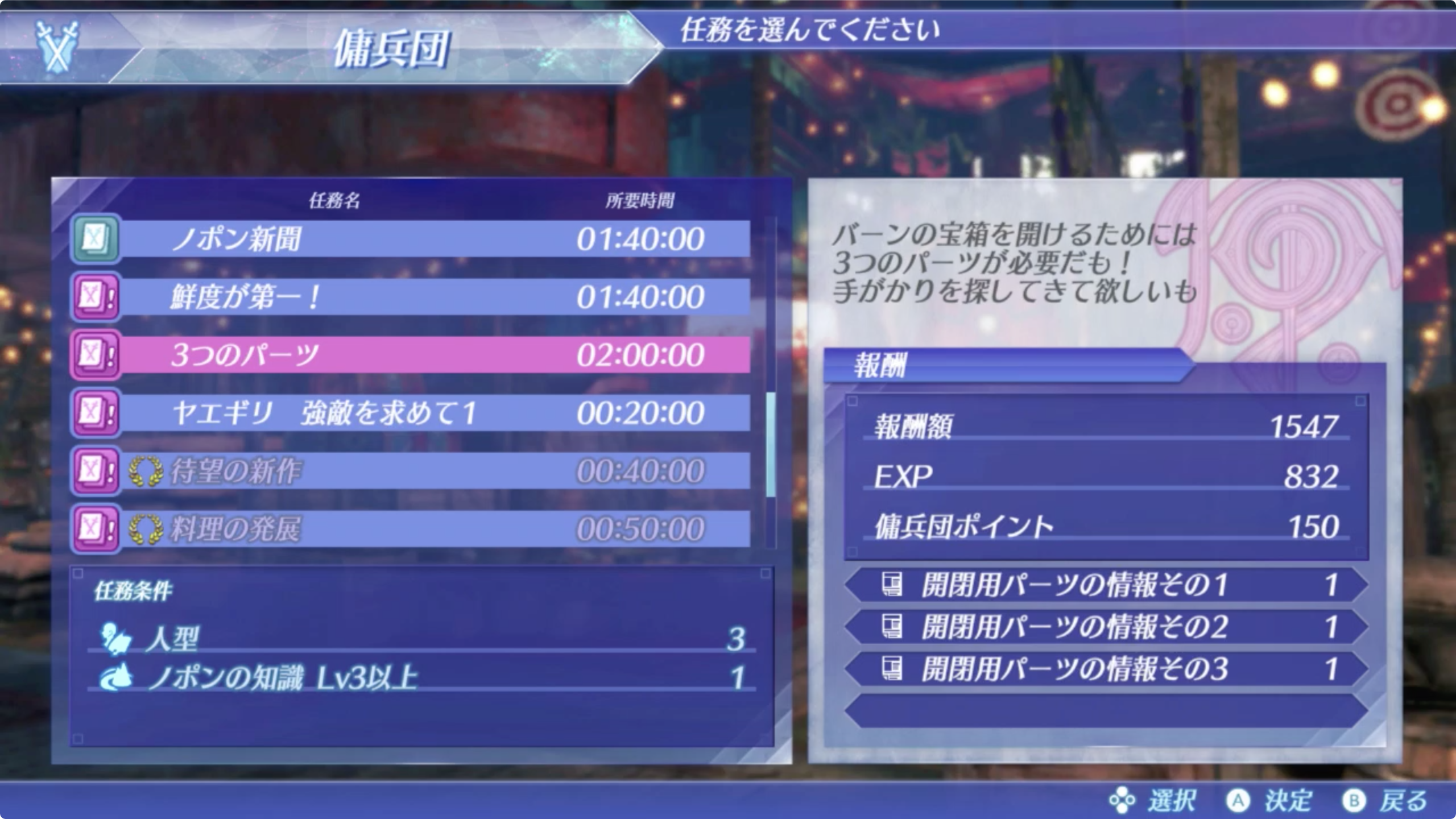 에텔보틀(エーテルボトル), 열쇠모양 레버(カギ型レバー), 필라멘트 구슬(フィラメント球)를 구해야하는데 각 파츠들이 있는 장소는 용병단 임무 '3개의 파츠(3つのパーツ)를 통해 입수할 수 있다.