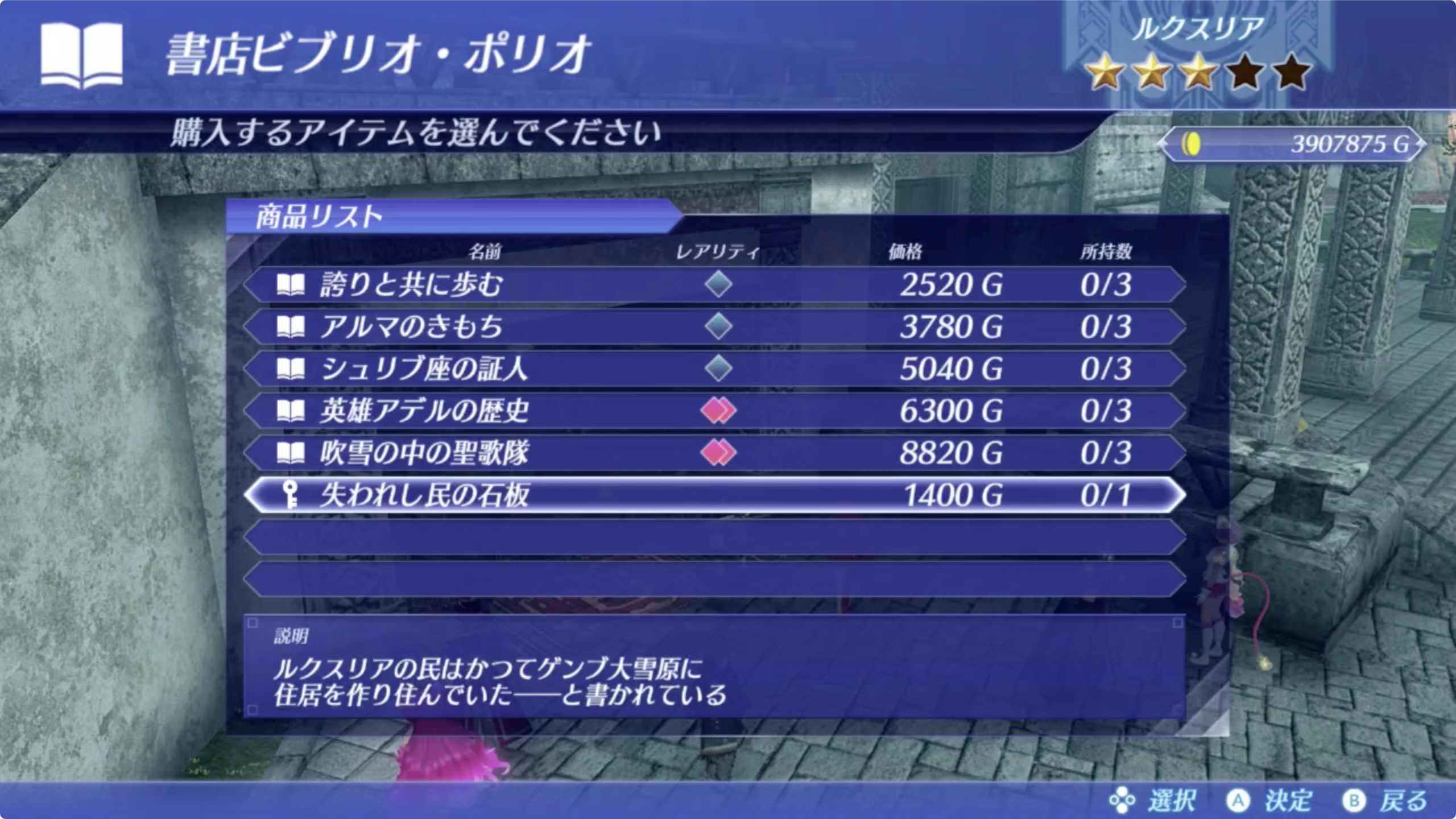 왕도 테오스아우레(王都テオスアウレ)의 서점 비브리오 폴리오(書店ビブリオ・ポリオ)에서 잃어버린 백성의 석판(失われし民の石版)을 구매하자.