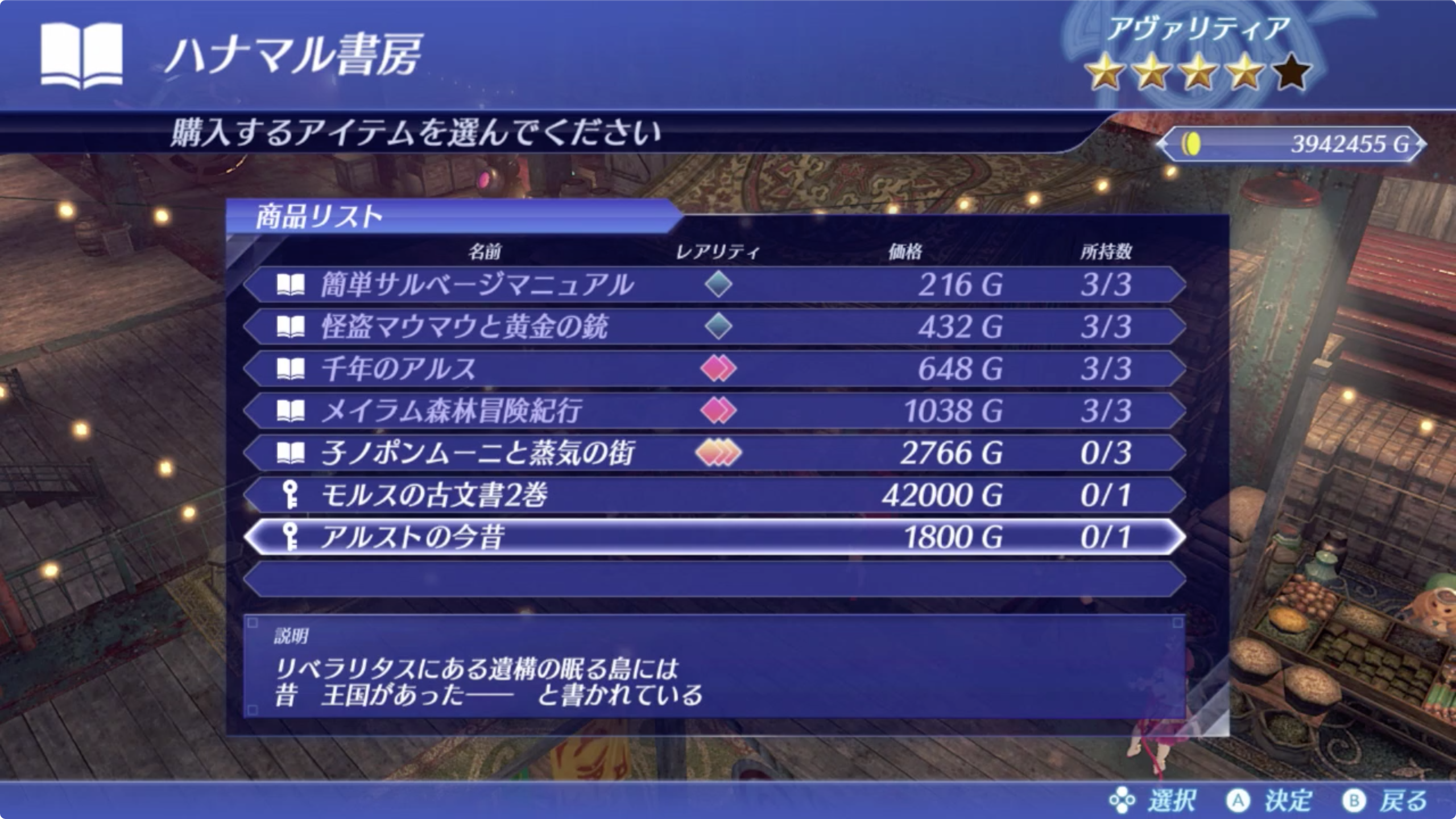 아바리티아의 하나마루서점(ハナマル書房)에서 알스트의 현재와 과거(アルストの今昔)를 구매한다.