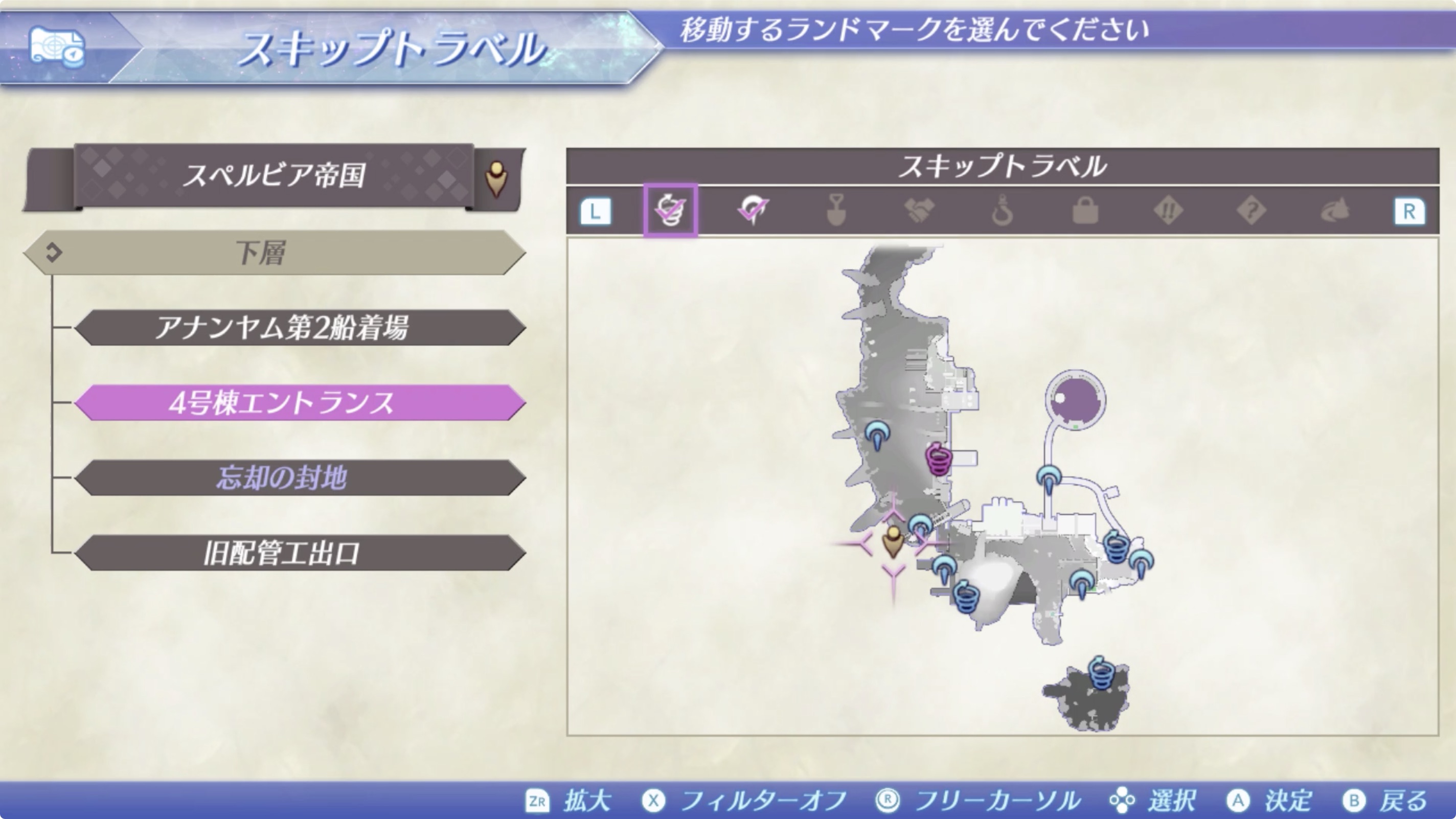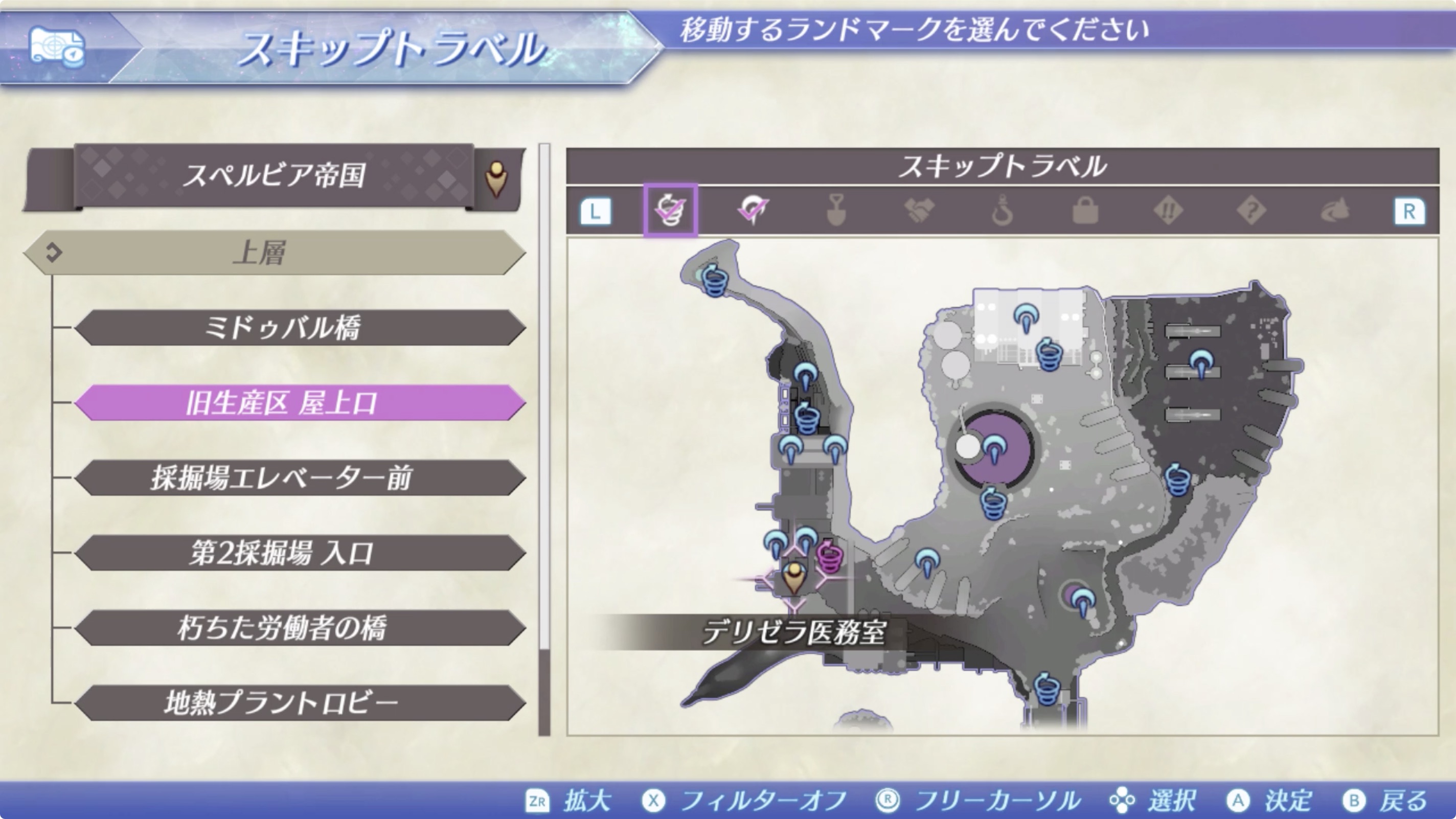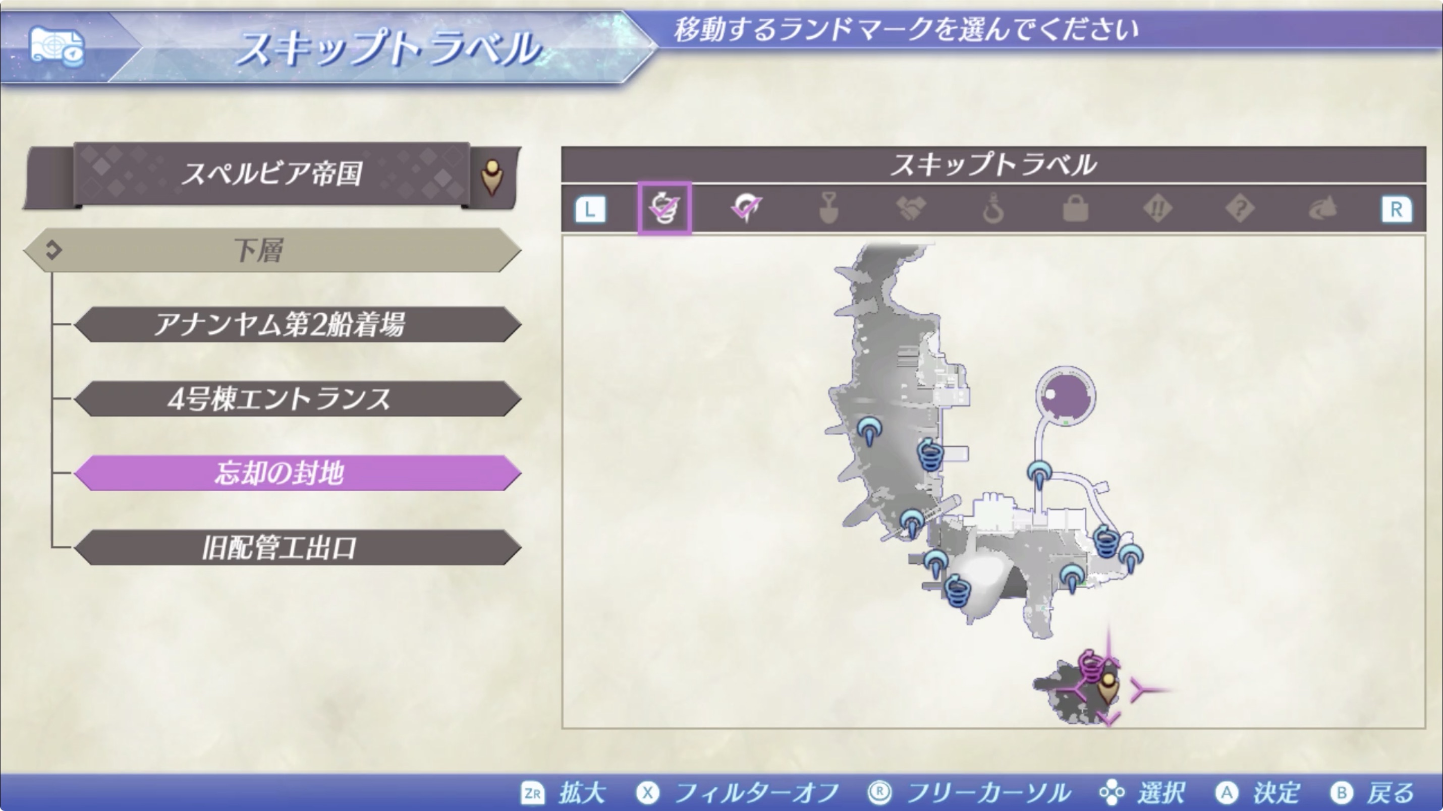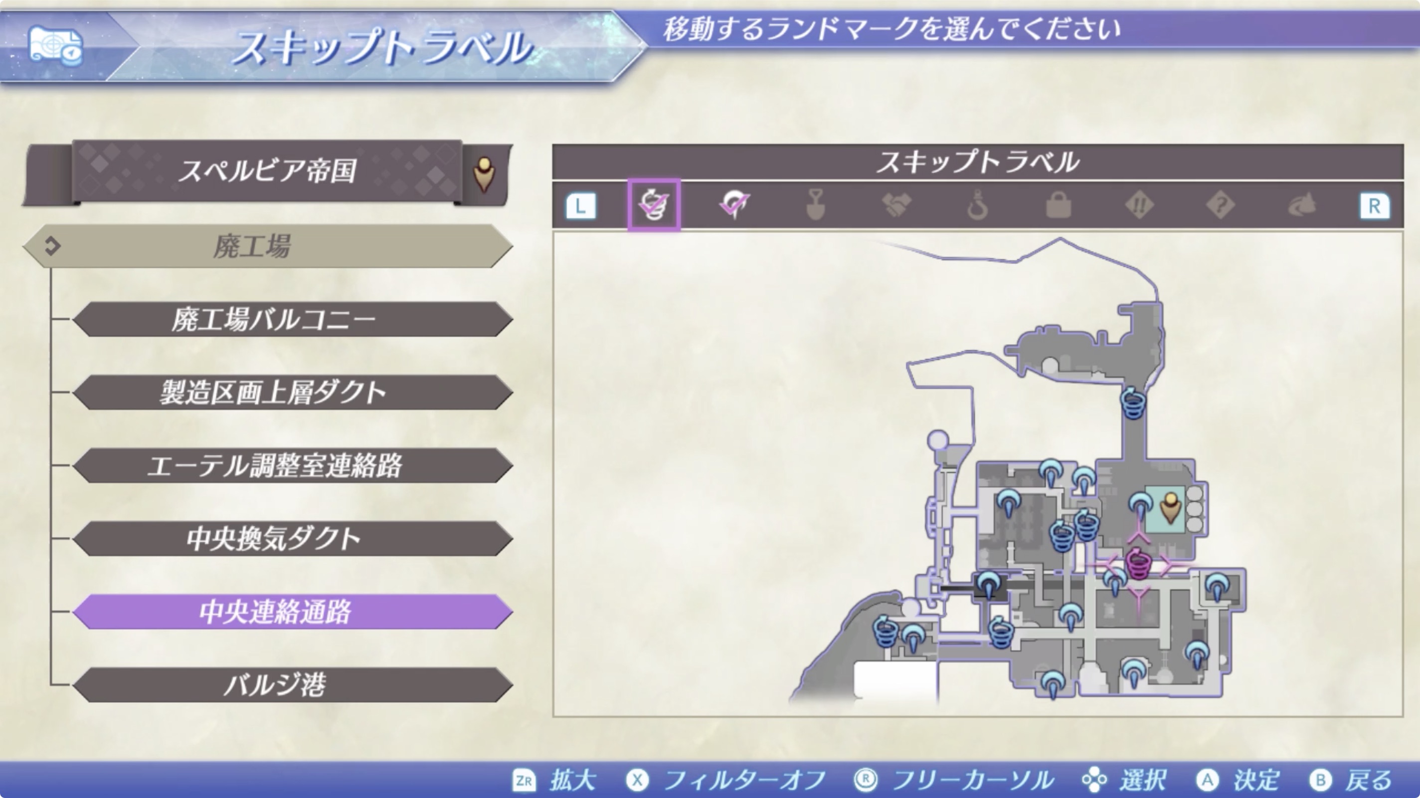 스펠비아 > 폐공장 > 중앙 연결 통로(中央連絡通路)의 북쪽 or 바루지 항구(バルジ港)의 남쪽으로 이동.