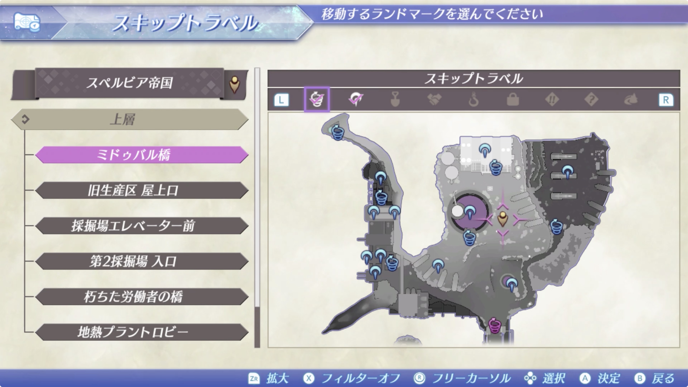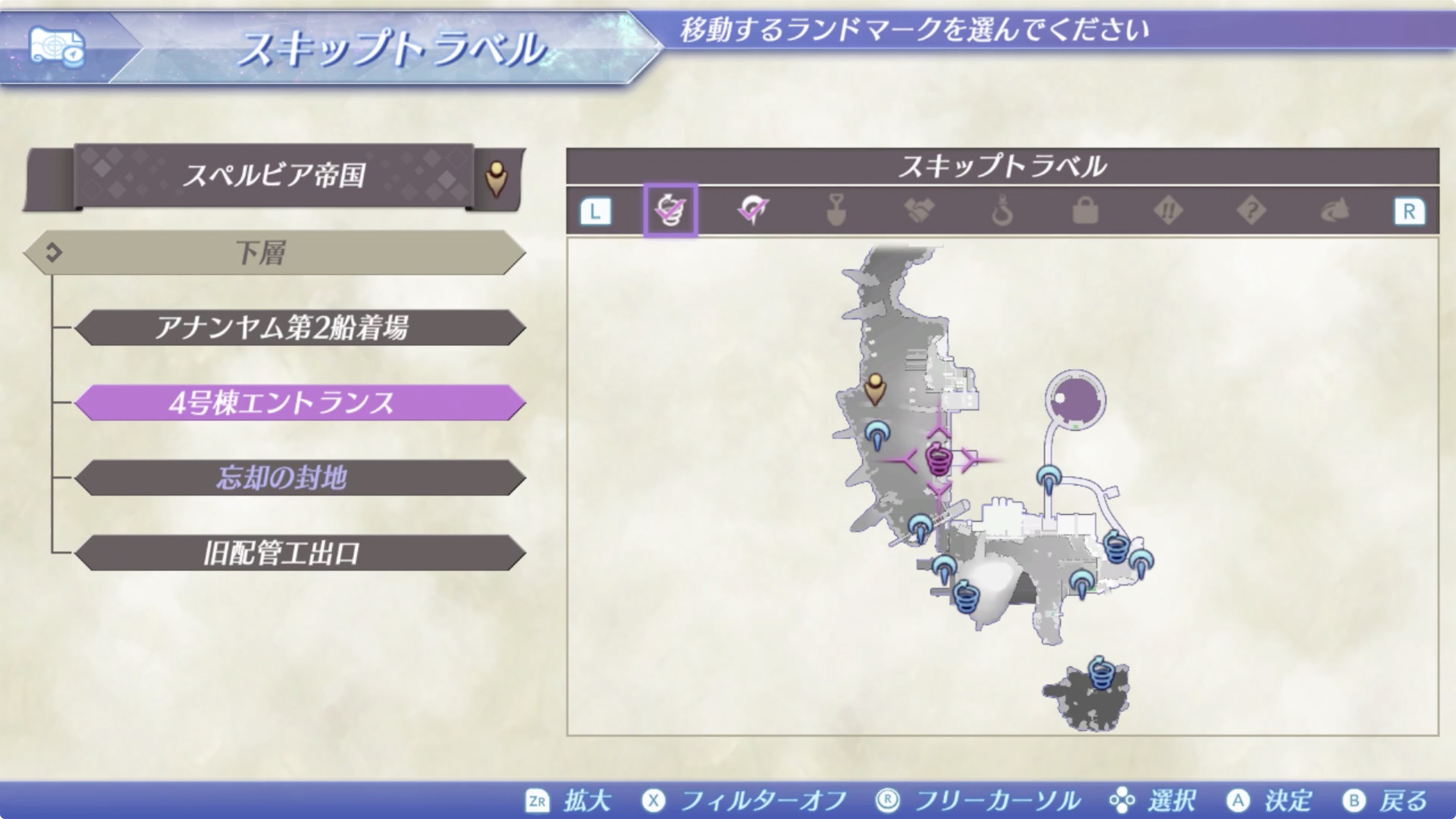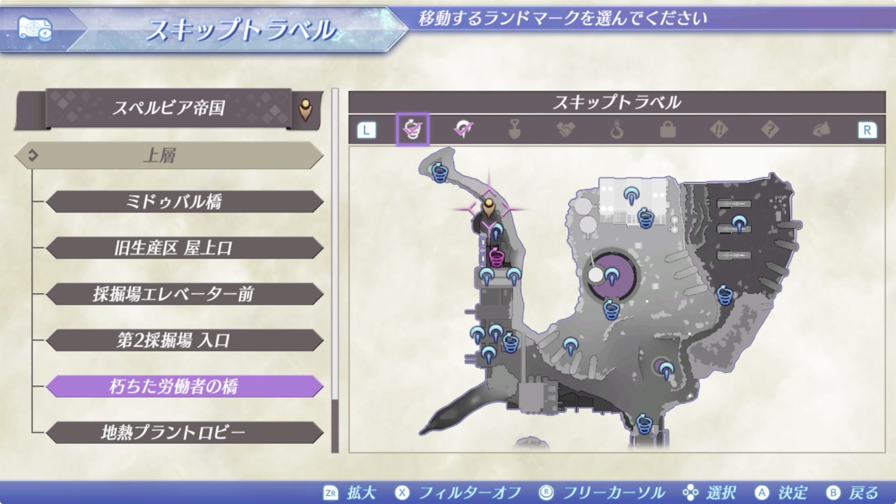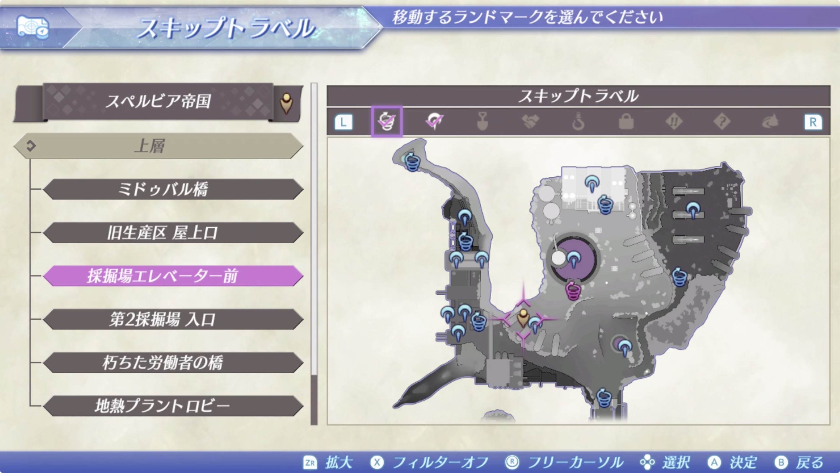 스펠비아 > 폐공장 > 중앙 연결 통로(中央連絡通路)의 북쪽 or 바루지 항구(バルジ港)의 남쪽으로 이동.
