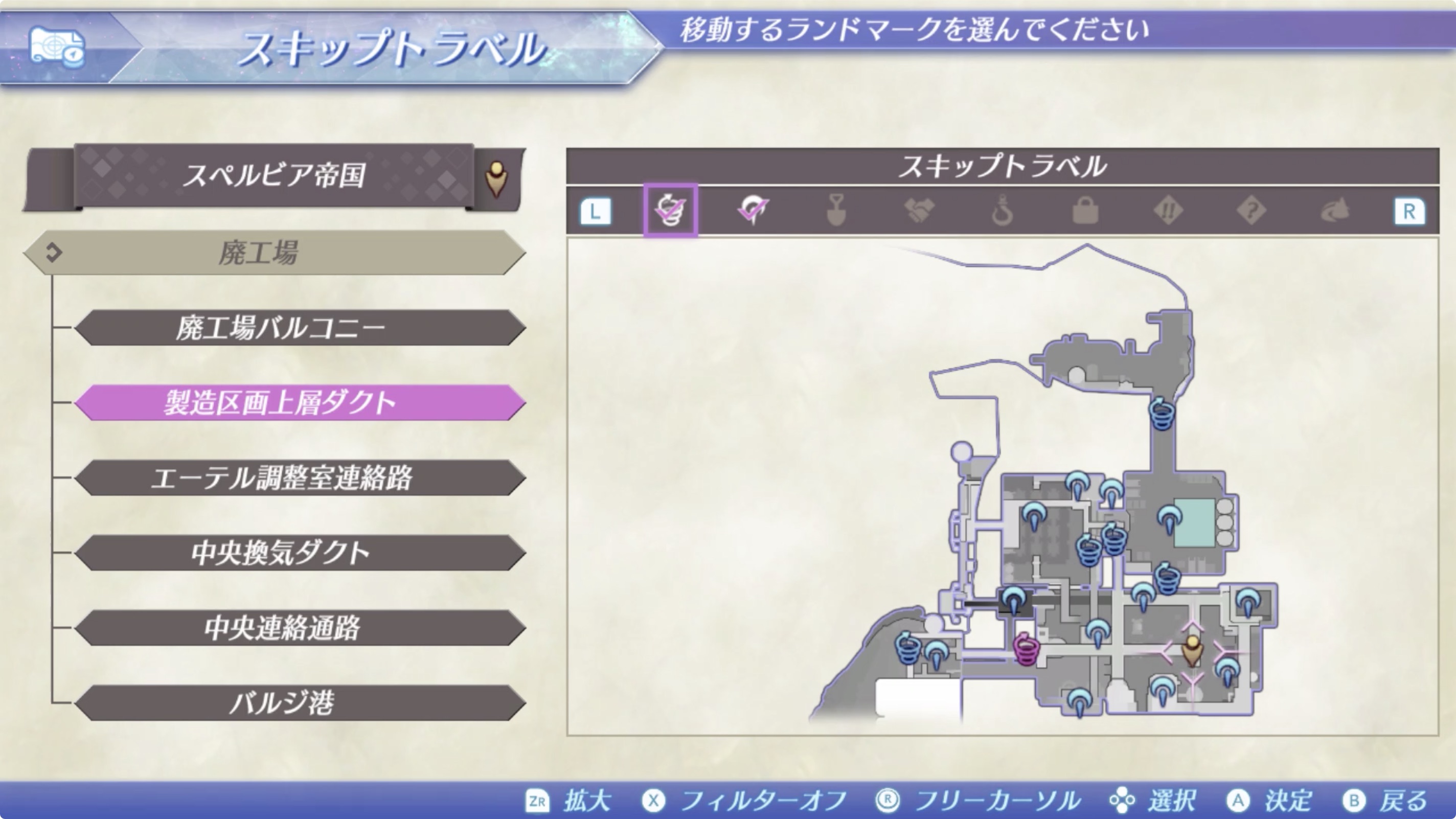 스펠비아 > 폐공장 > 제조 부지 상층 덕트(製造区画上層ダクト)에서 정면의 길을 따라 이동.