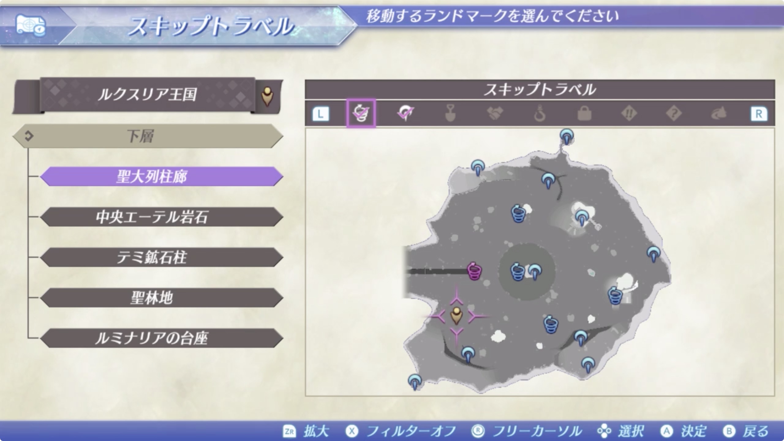 이곳은 룩스리아 하층의 남서쪽 끝에 위치하고있는데, 이곳으로 가기 위해선, 성대열주랑(聖大列柱廊)의 남서쪽에 위치한 연못 (*아래 지도참고)을 통해 이동 할 수 있습니다. *수속성의힘Lv5(水属性の力Lv5), 인내력Lv3(忍耐力Lv3) 필요.