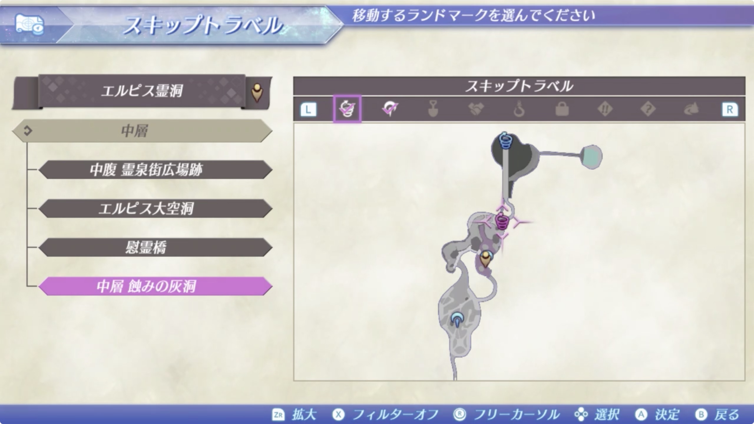 ① 엘피스영동(エルピス霊洞) > 중층(中層) > 침식의 회동(中層 蝕みの灰洞)에서 안쪽으로 이동.