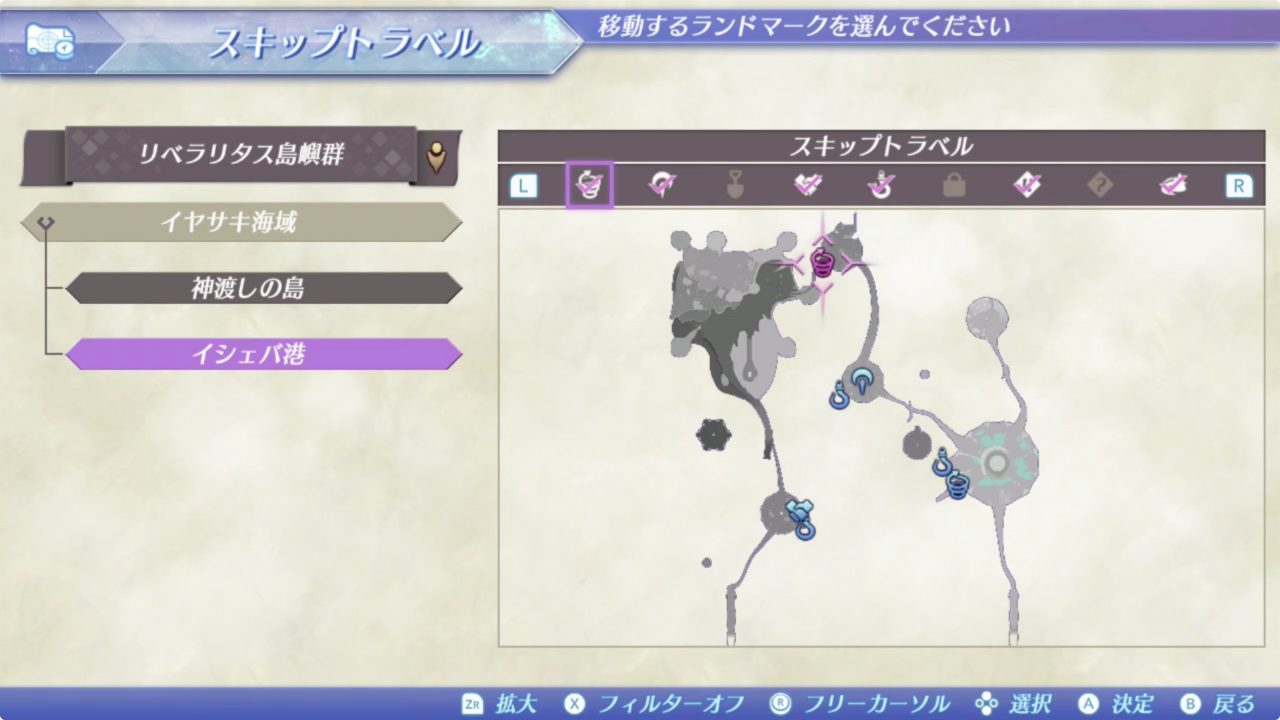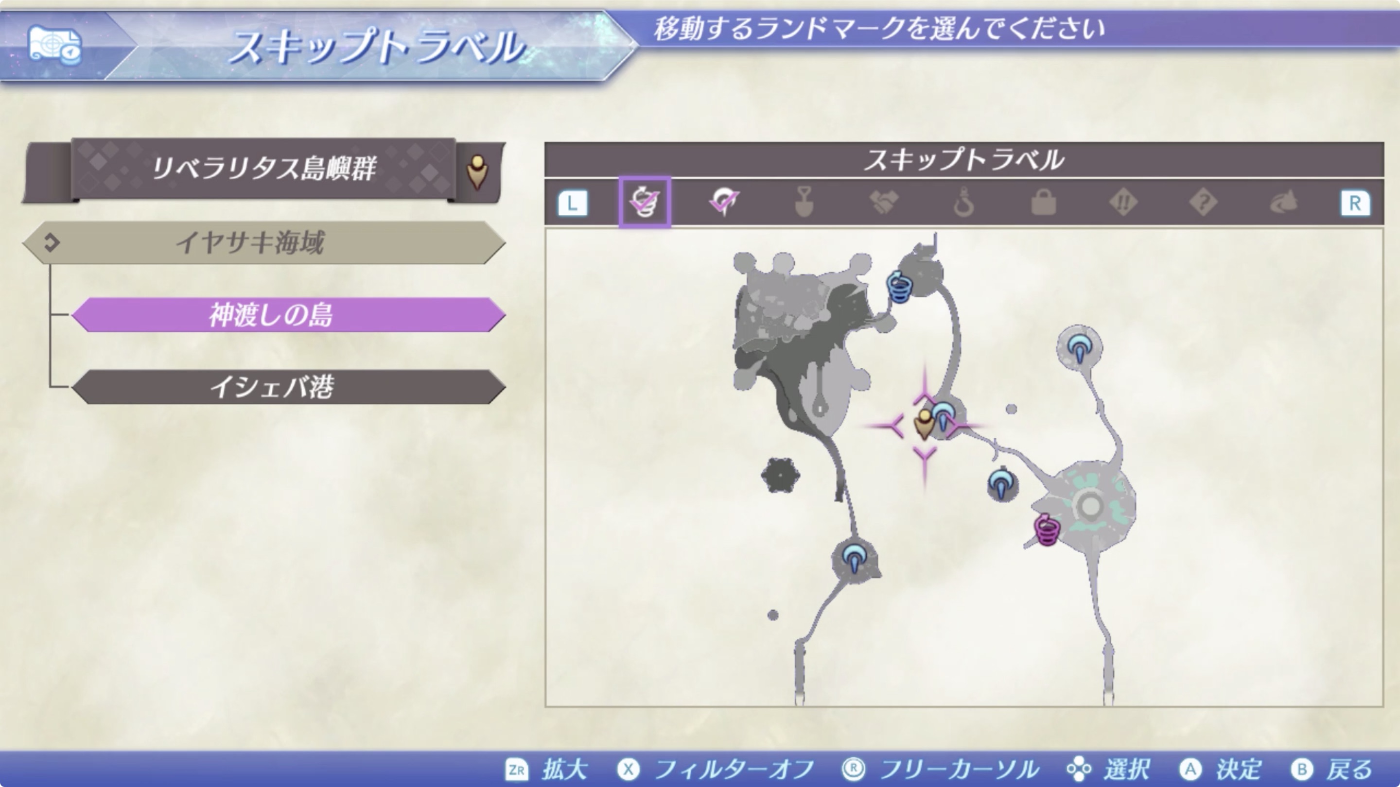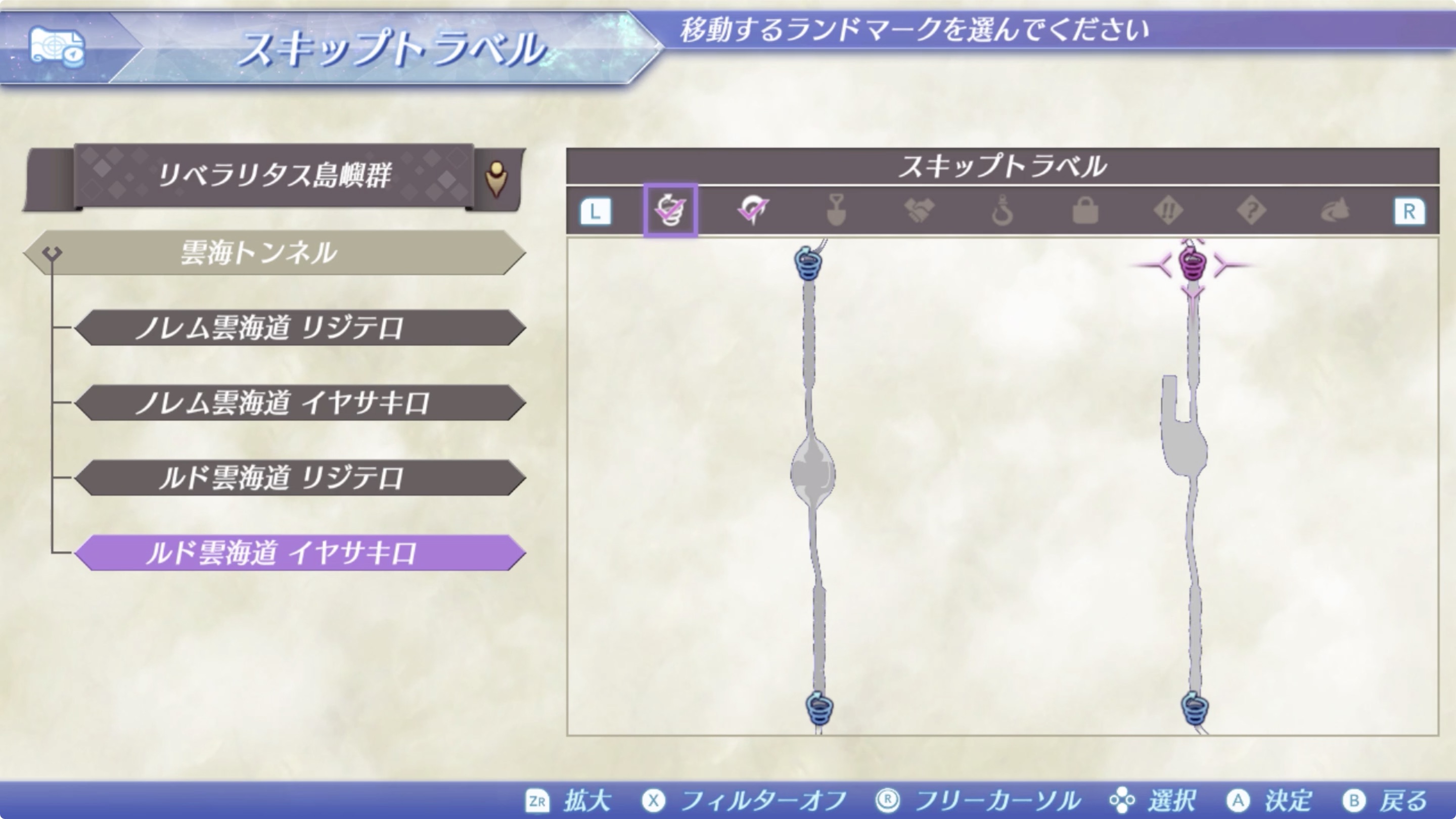 *이곳으로 이동하기 위해선 리베라리타스 도서군(リベラリタス島嶼群) > 운해 터널(雲海トンネル) > 루드 운해도 이야사키 입구(ルド雲海道 イヤサキ口)에서 북쪽으로 이동하여 미끄러지는 도중 오른쪽 갈림길에서 점프를 해야한다. 아래 추가 이미지 참조.
