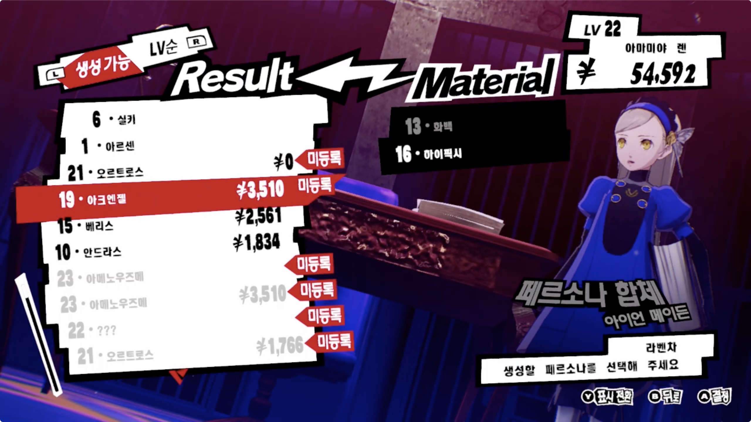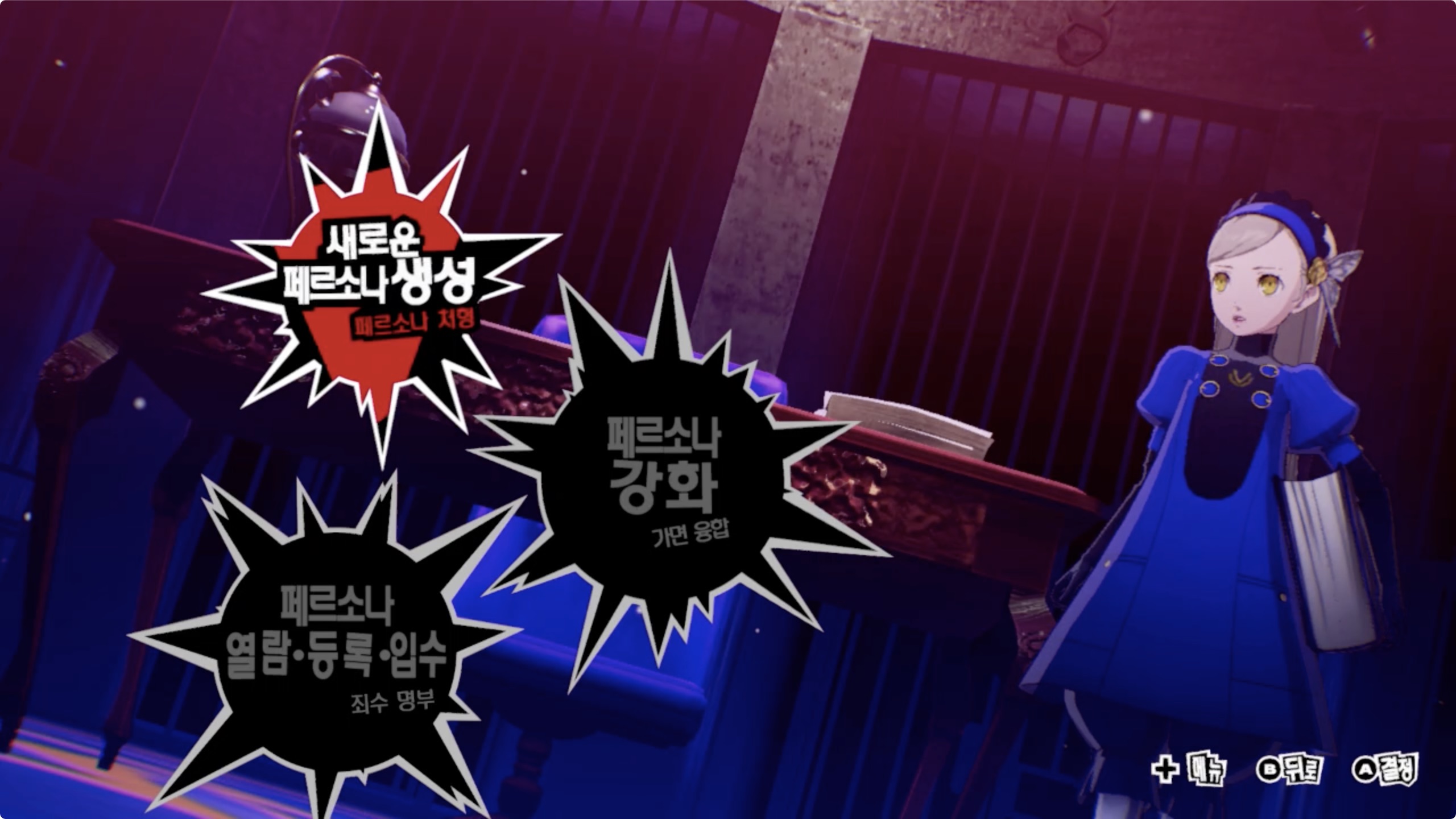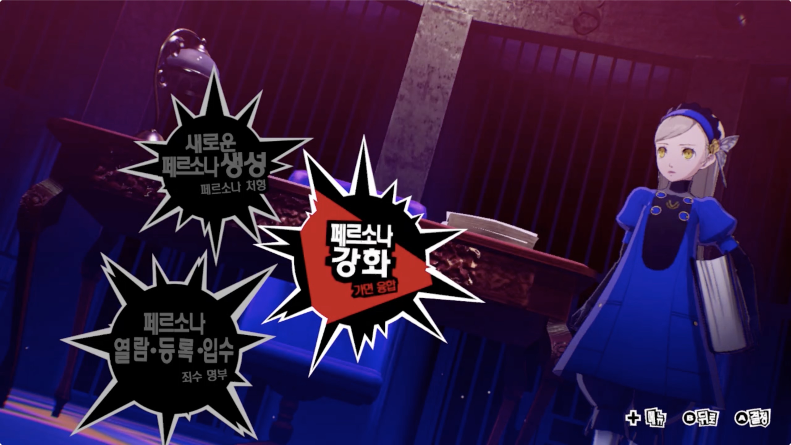 ① 우선 리퀘스트처럼 원하는 페르소나를 만들기 위해선 벨벳 룸에서 [새로운 페르소나 생성] 항목을 이용합니다.