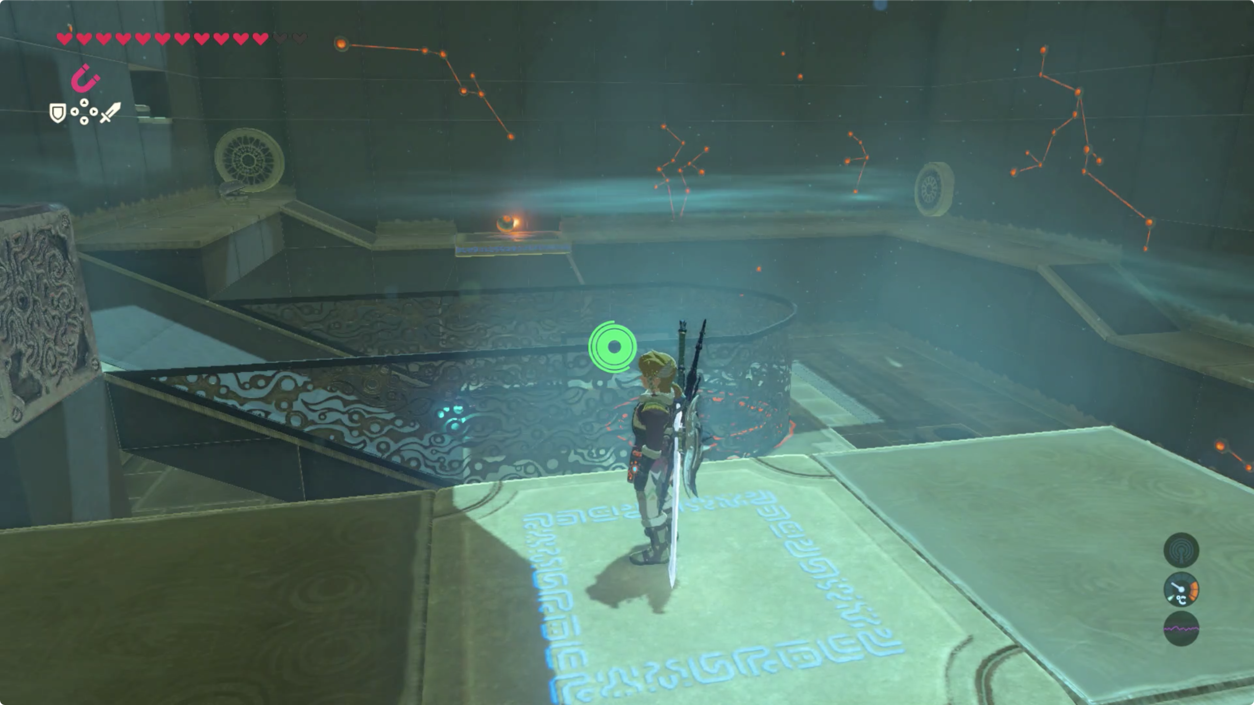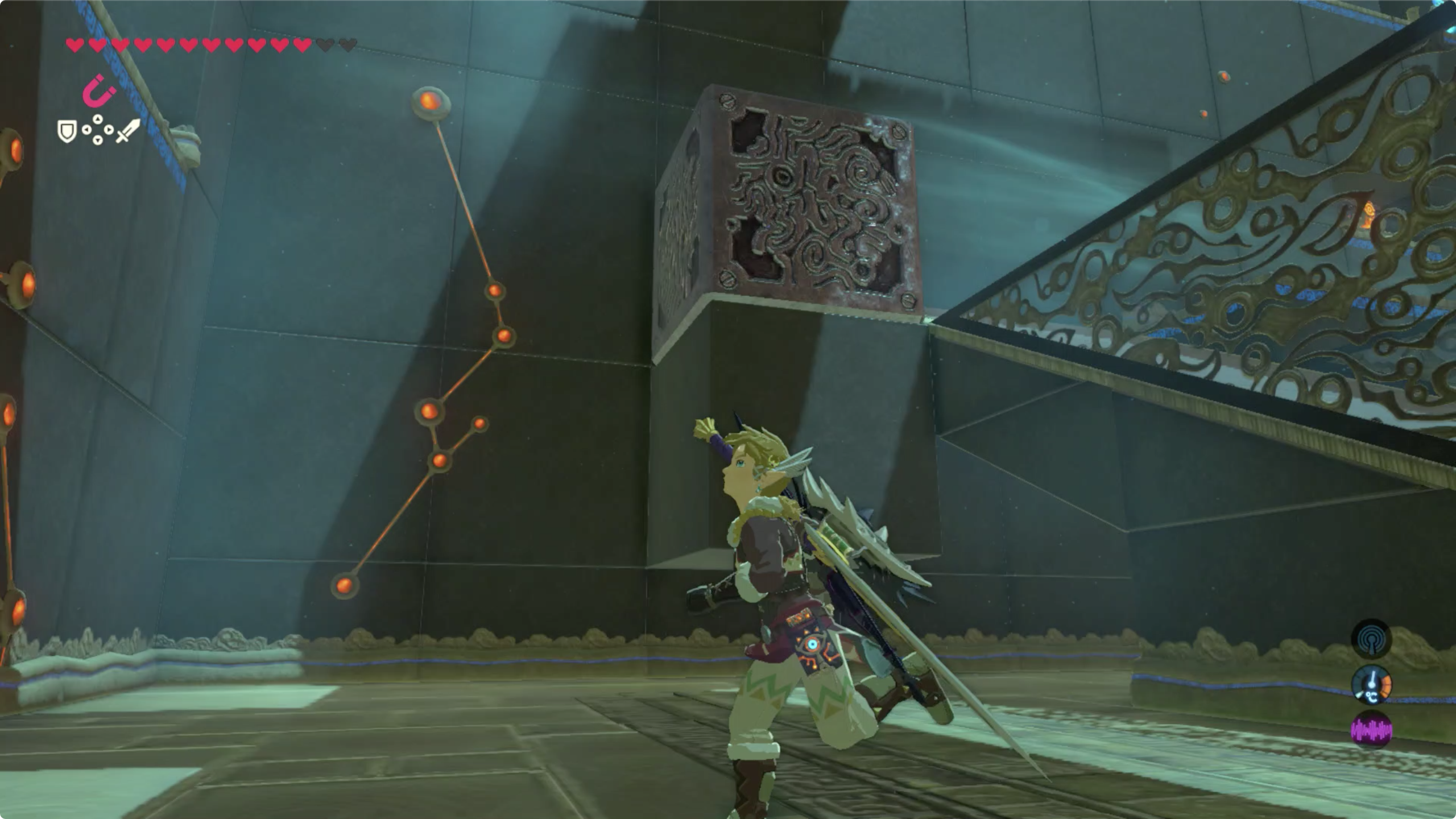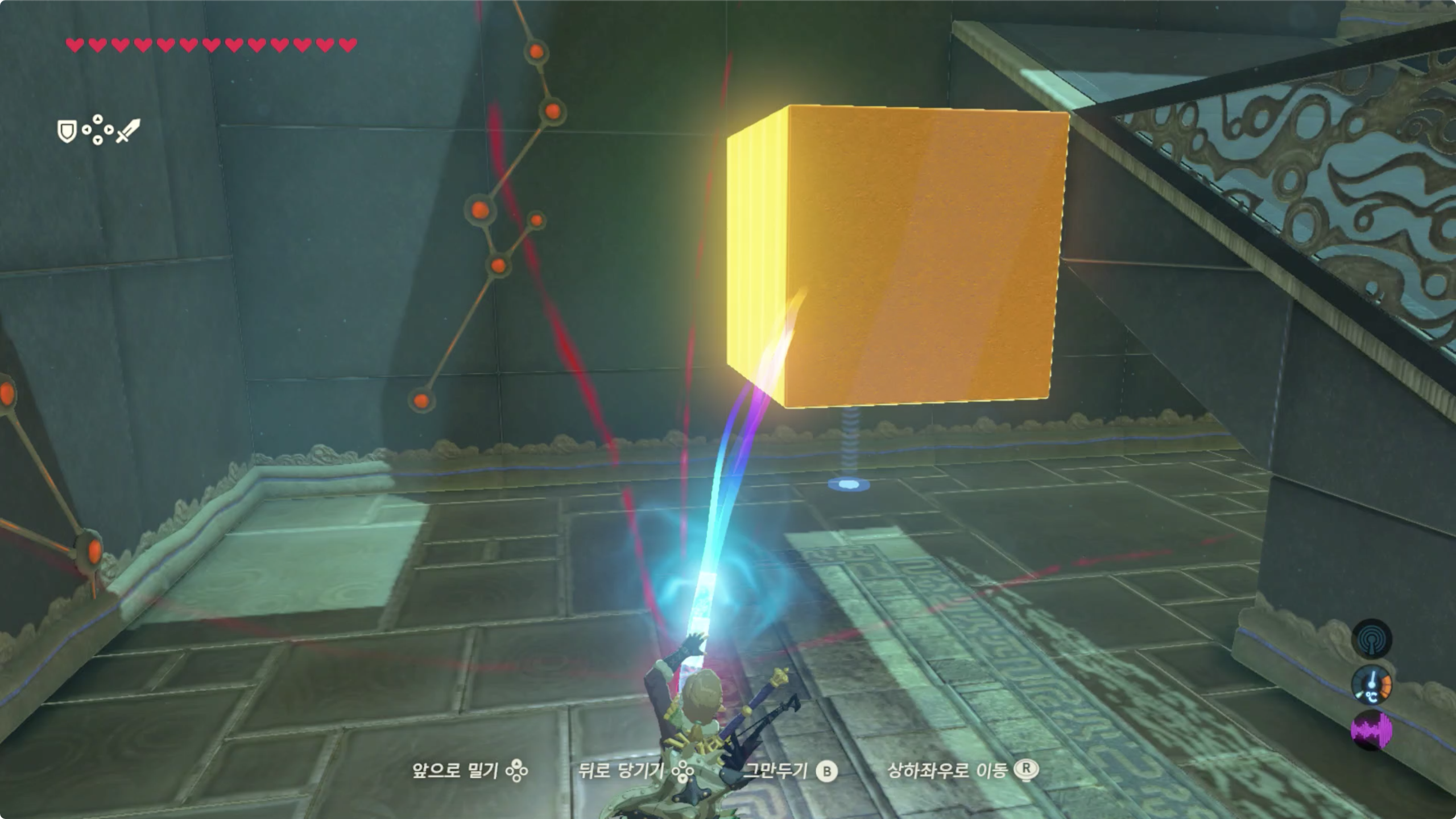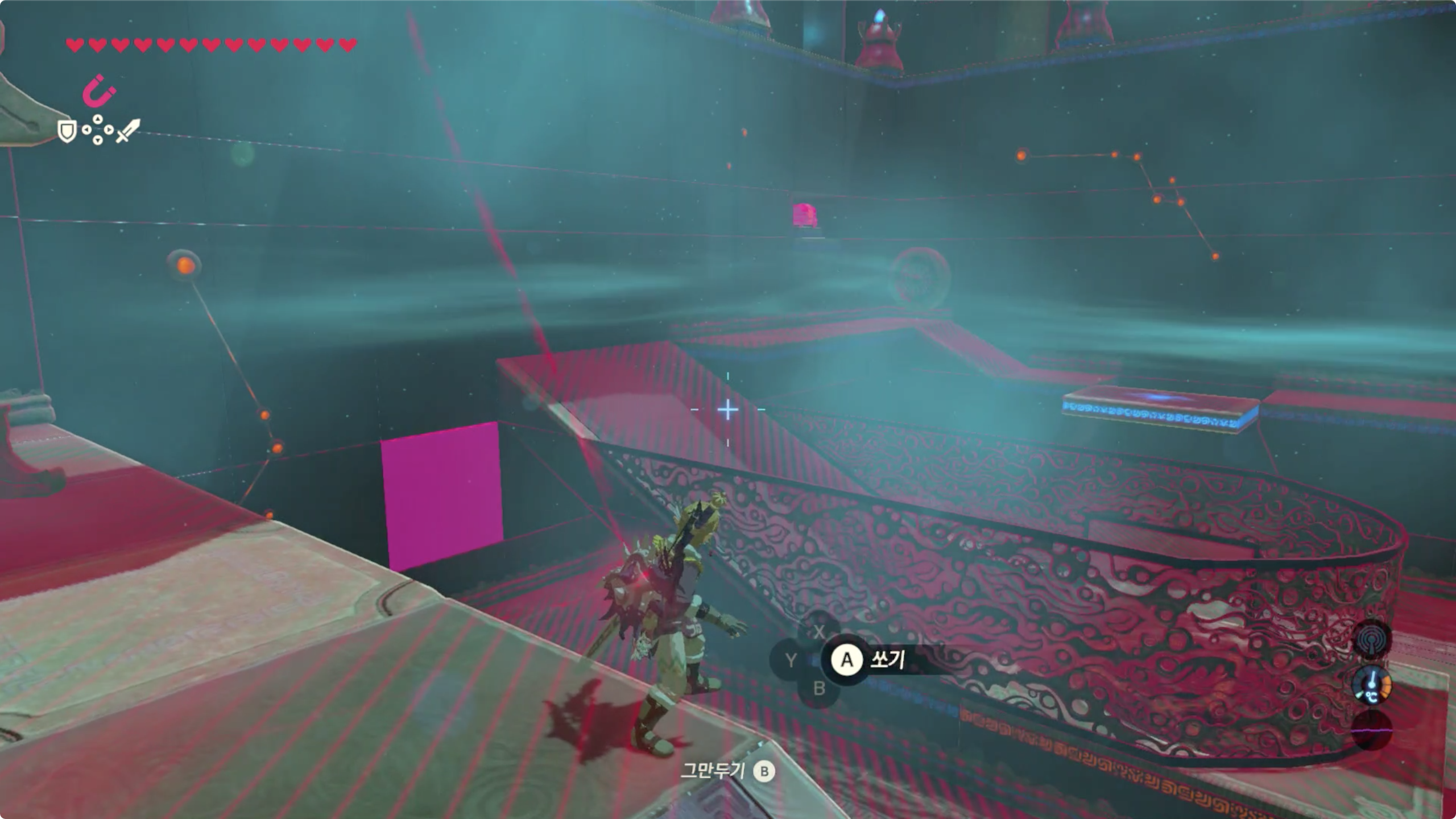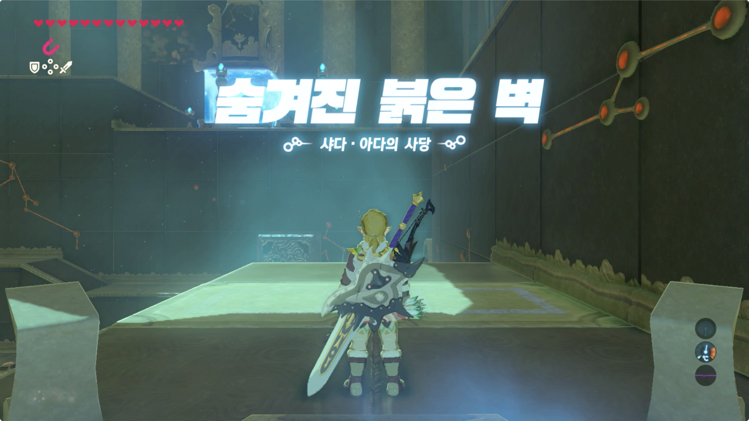 사당의 시련이름을 생각하며 마그넷 캐치로 주변을 둘러보면 숨겨진 붉은 벽을 발견 할 수 있다. (보물상자도 덤으로)