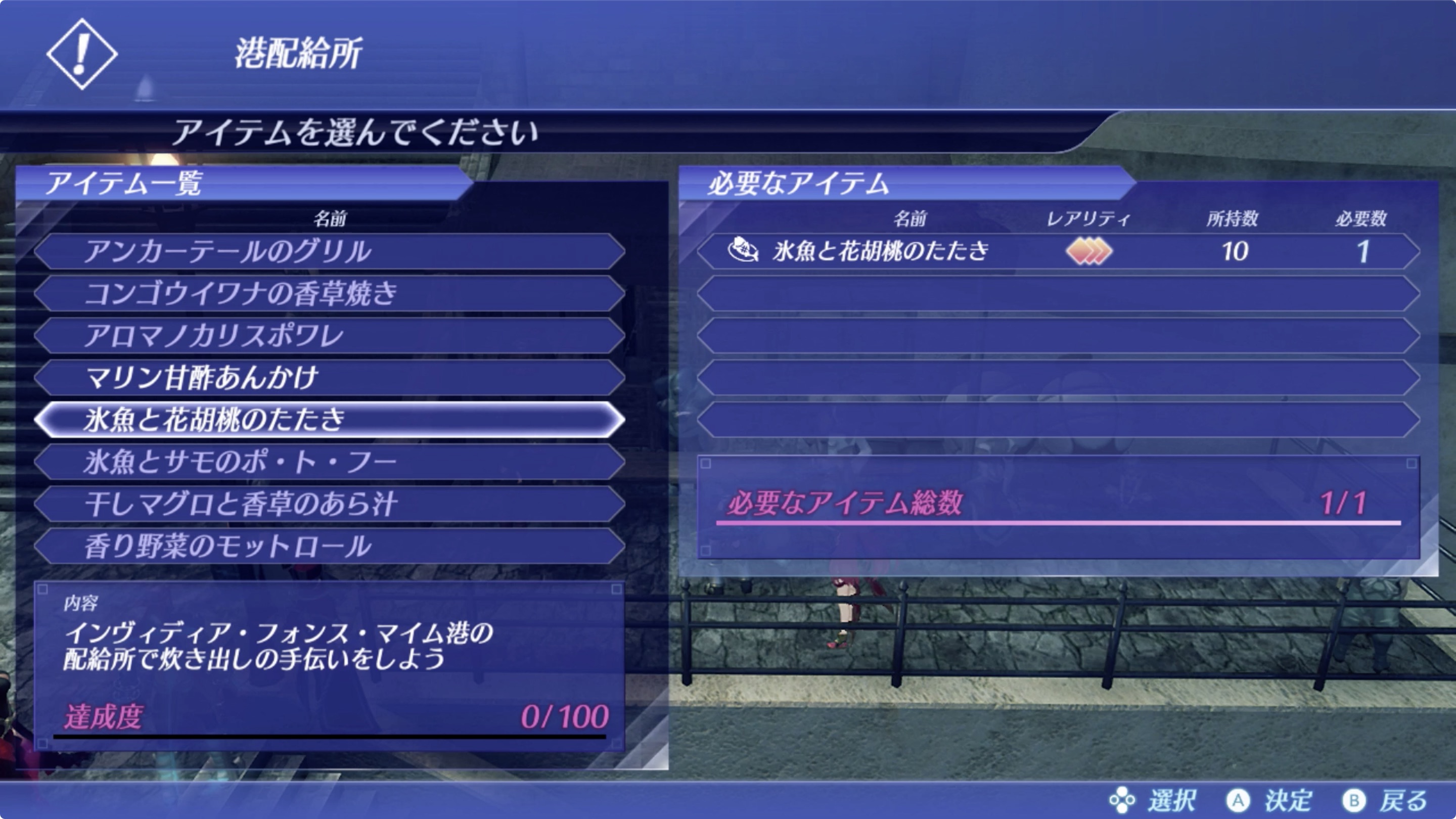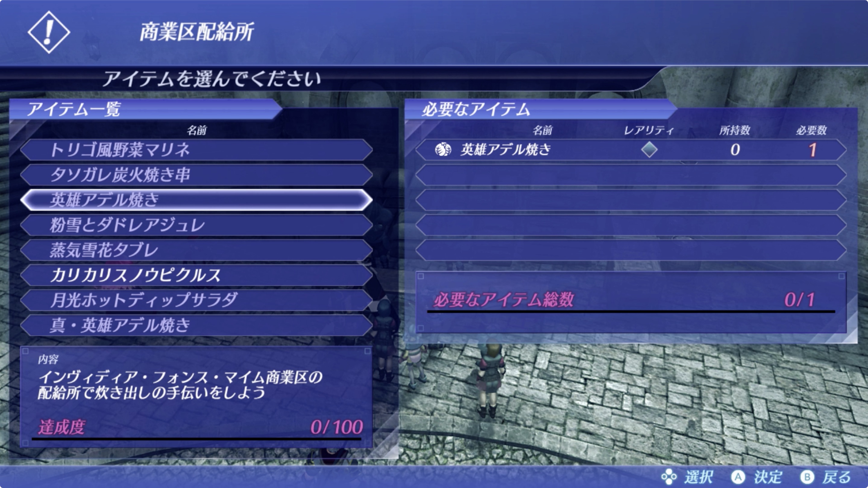 달성도를 100%로 만드는게 목표. 이번 퀘스트에 필요한 아이템들은 각 지역의 마을에 해당 상점에서 구매 가능합니다. (야채를 필요하면 야채 가게에서 구매)