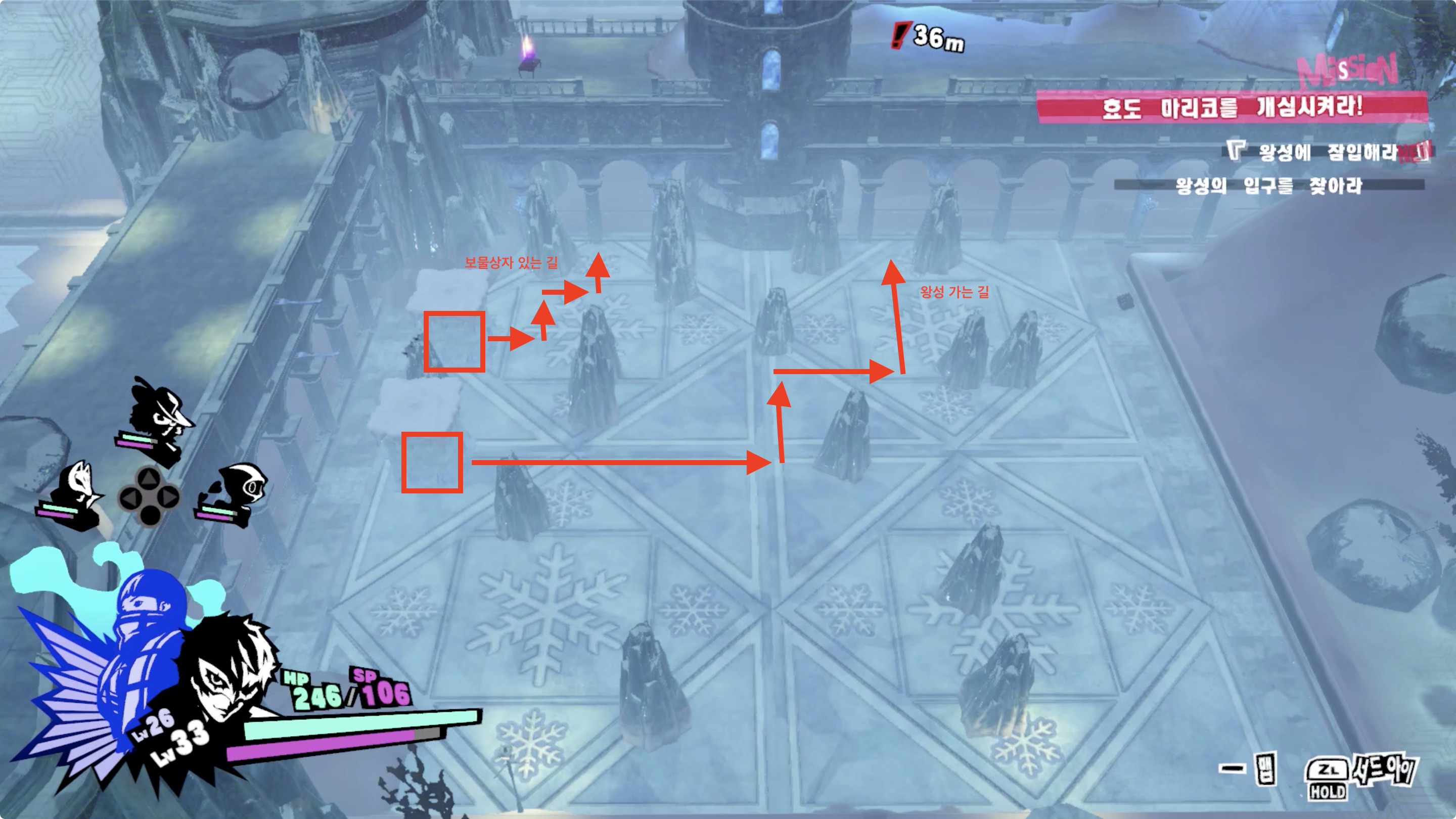• 밖으로 나간후 벽을 타고 올라가면 강적 [천권의 수호관], 강적 [소원 없는 별]과의 전투