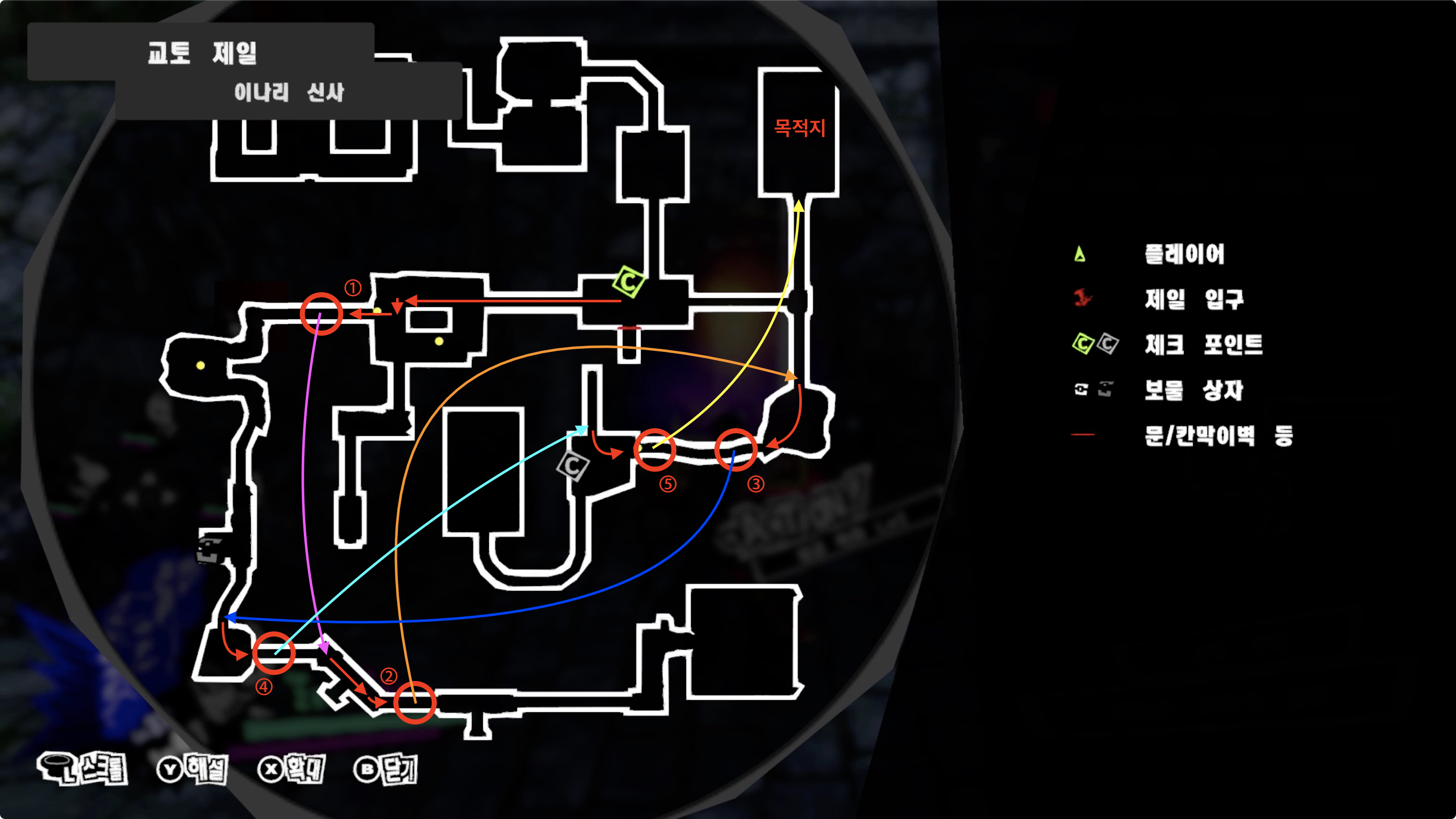 아래 지도를 참고하여 ① ~ ⑤ 순서대로 이동하면 목적지에 도착할 수 있습니다.