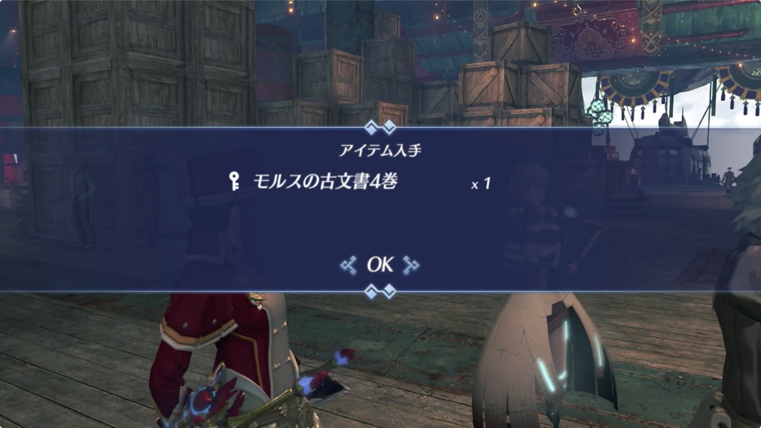 • 모루스의 고문서 4권(モルスの古文書4巻)을 구입한 후, 용병단 임무 「모루스의 고문서 4권의 해독」 (モルスの古文書4巻の解読)을 완료한다.
