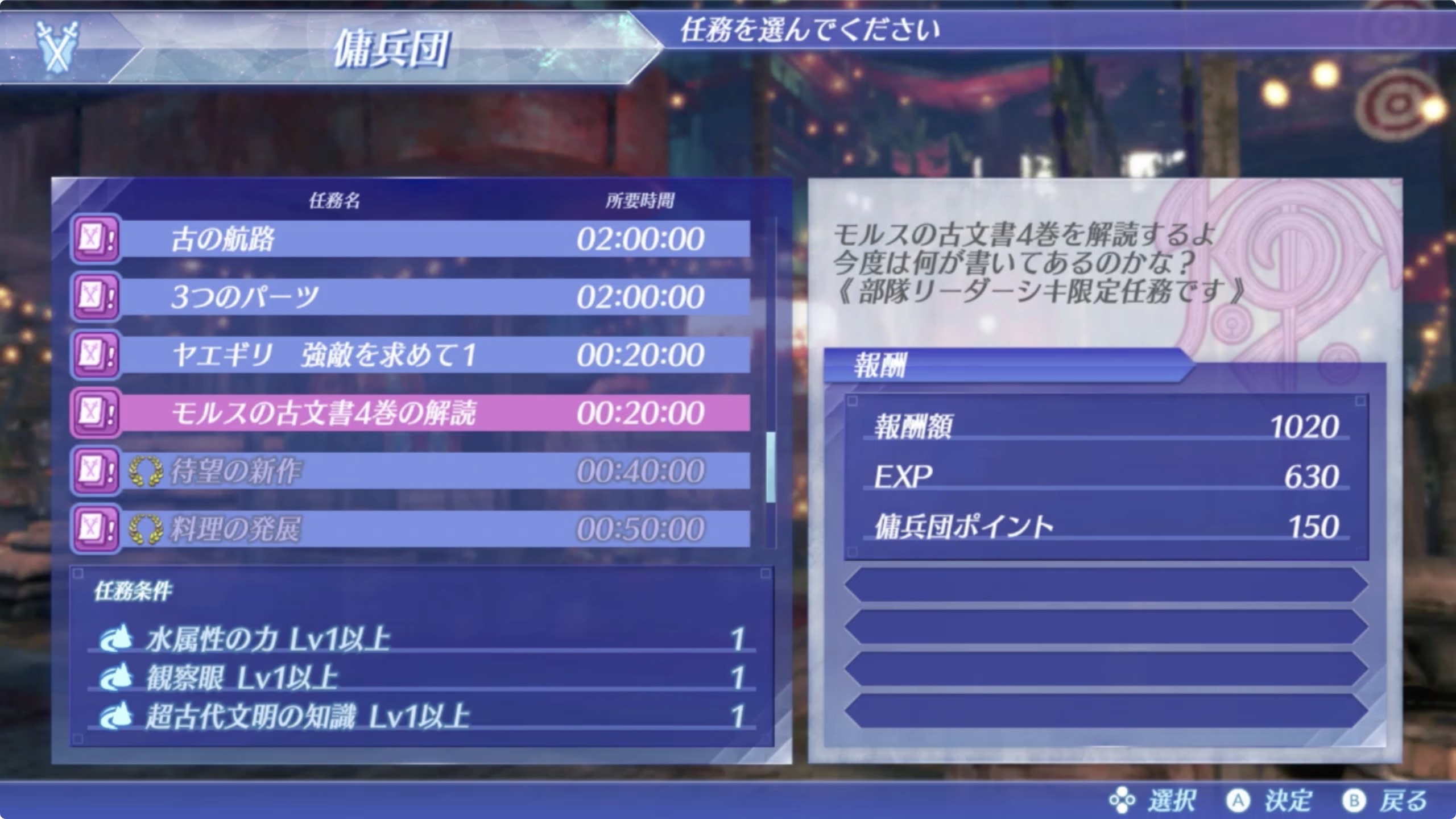 이제 용병단 임무 '모루스의 고문서 1권의 해독(モルスの古文書1巻の解読)'을 통해 완료하도록 합시다.