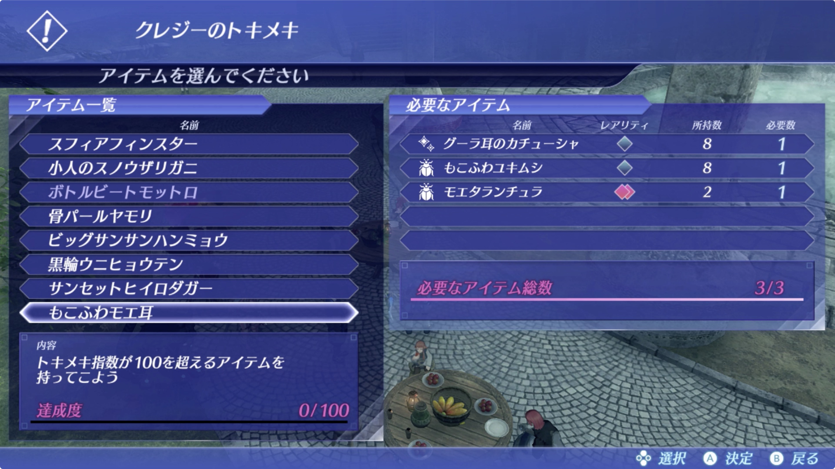 룩스리아의 케이크 상점 앞에 있는 쿠레지(クレジー)와 대화를 하게되면, 기발한 아이템을 모아 설레임 지수를 높여달라고 합니다.