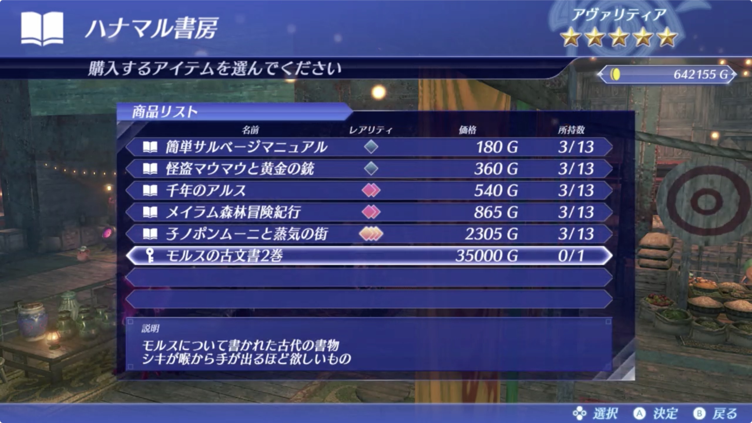 모루스의 고문서 2권은 아바리티아 상회(アヴァリティア商会)의 하나마루 서점(ハナマル書房)에서 35000G로 구매 할 수 있습니다.