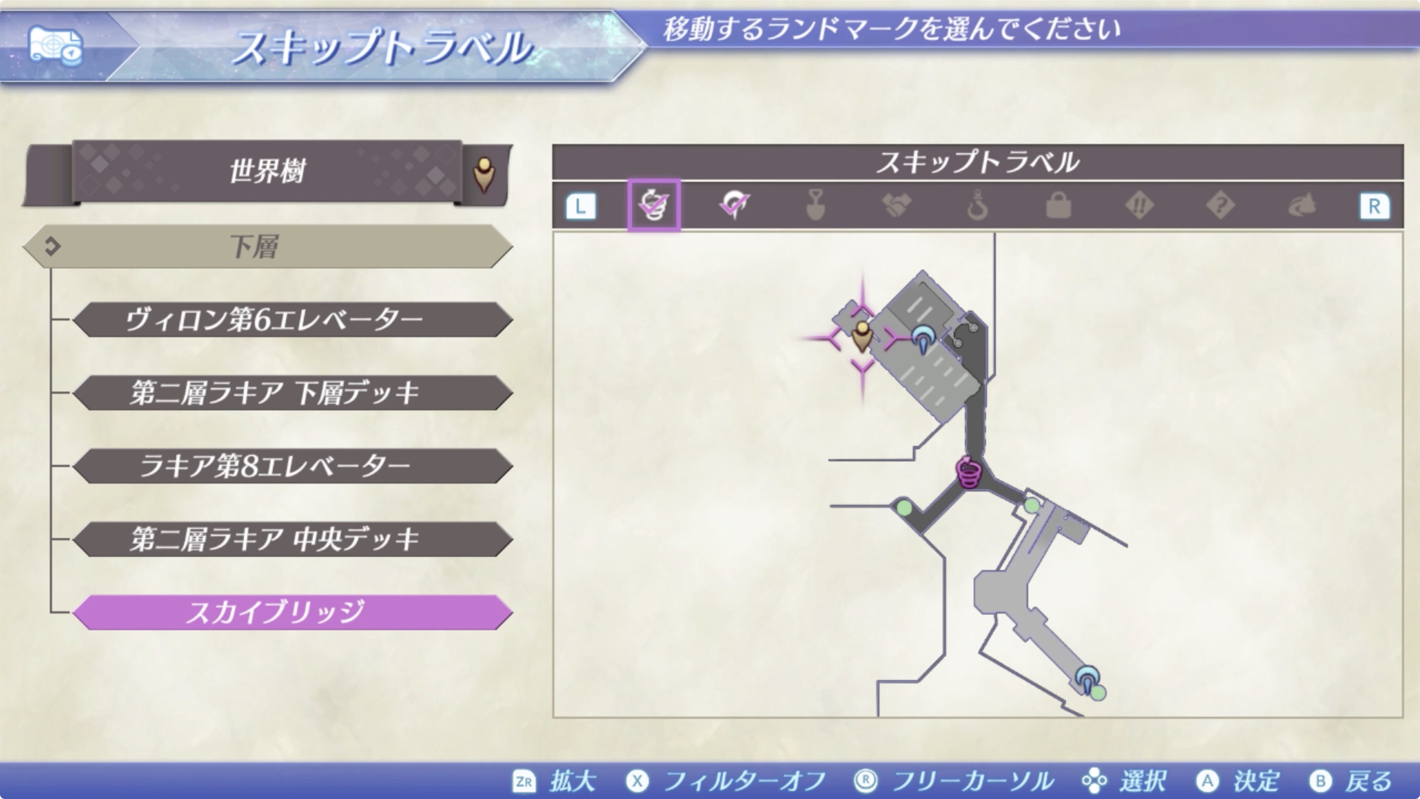세계수 > 하층(下層) > 스카이브릿지(スカイブリッジ)의 북쪽으로 가서 관리실 끝에 있는 제어 패널制御パネル)을 조사하면 새로운 길이 나타나며 안쪽에서 이벤트와 함께 전투가 발생합니다.