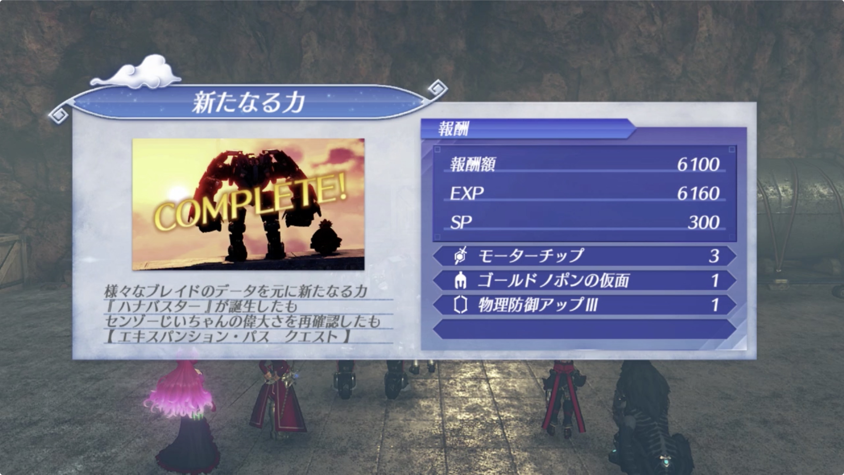 보상 아이템 : 모터 칩(モーターチップ) x3, 골드노폰의 가면(ゴールドノポンの仮面), 물리방어업III(物理防御アップIII)