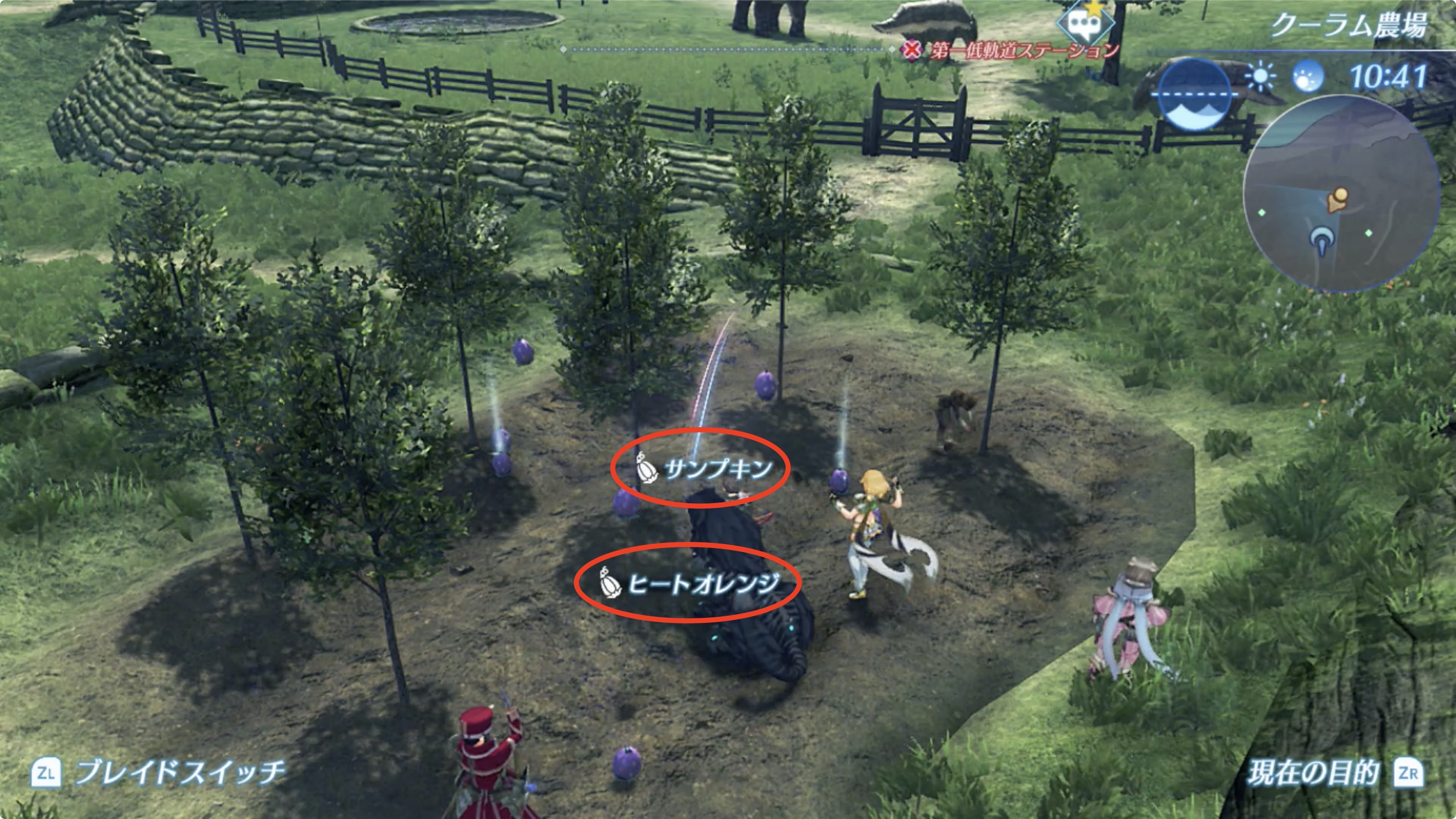 토리고 기지 정문으로 이동한 후 우측인 농장쪽을 보면 채집 포인트가 3개정도가 가까이 있습니다. 이곳 모두에서 히트 오렌지( ヒートオレンジ)와 05번 항목에서 필요한 샘프킨(サンプキン)을 획득 할 수 있습니다.