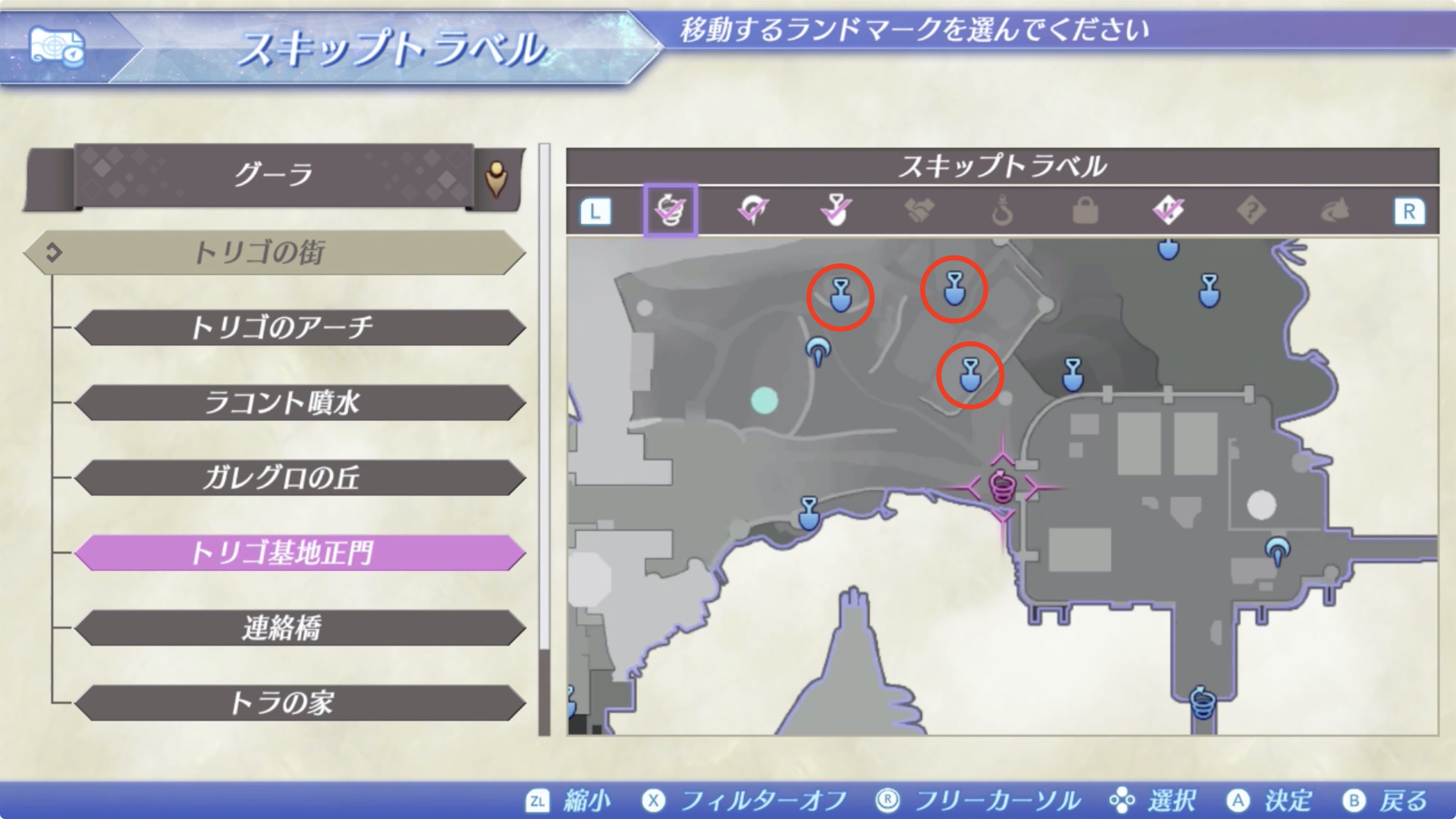 구우라(グーラ) > 토리고마을(トリゴの街) > 토리고기지 정문(トリゴ基地正門)으로 이동한 후 순차적으로 보이는 밭의 채집 포인트 3곳 모두.