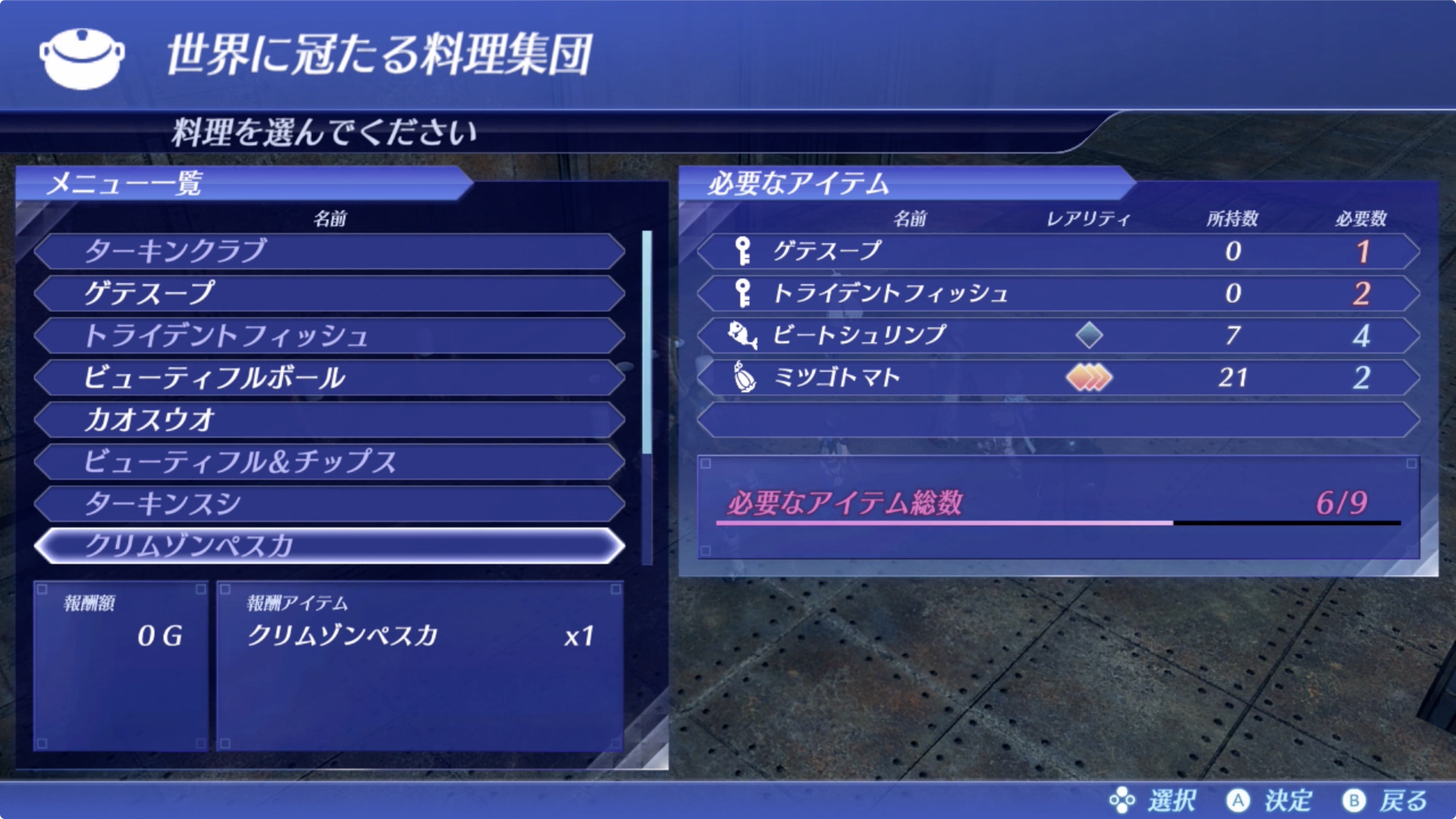이 요리는 메뉴 목록을 통해 만들수 있는 다른 요리인 게테스프(ゲテスープ)와 트라이던트 피쉬(トライデントフィッシュ) 2개가 재료로서 함께 필요합니다. 각각의 재료 수집처에 대한건 아래 내용을 참고해주세요 .