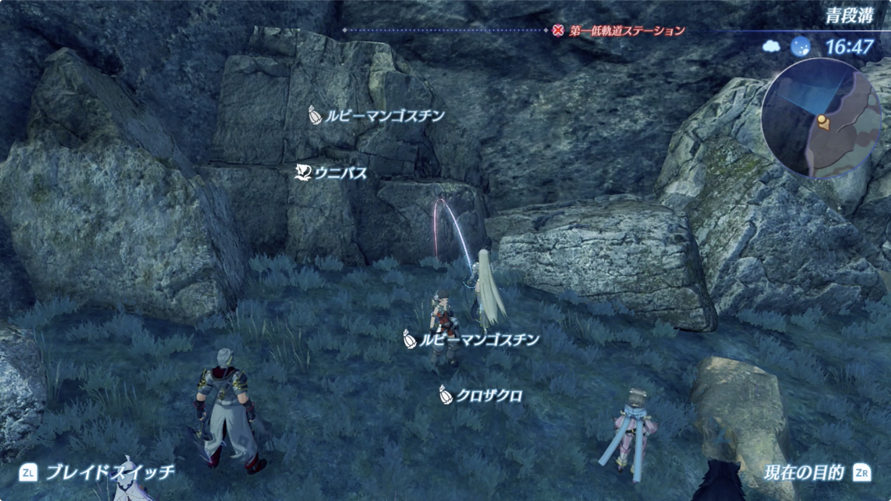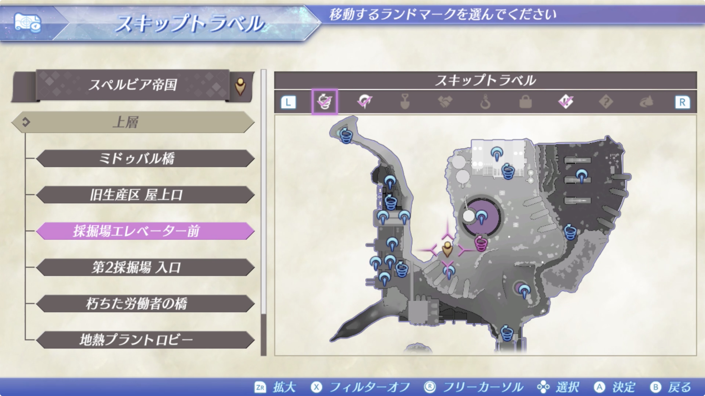 스펠비아제국(スペルビア帝国) > 상층(上層) > 채굴장 엘리베이터 앞(採掘場エレベーター前)의 남서쪽 채집 포인트.